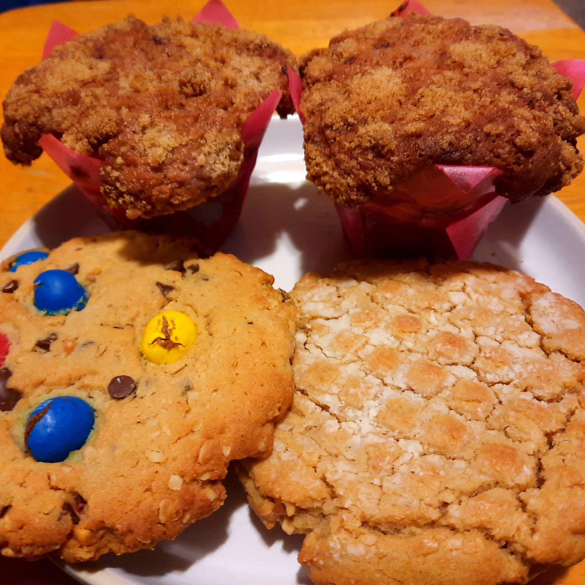 I grabbed two tripleberry muffins, a chocolate chip M&M cookie and a peanut butter cookie to-go. They all look great (see pic) but only had a muffin so far and it was everything...