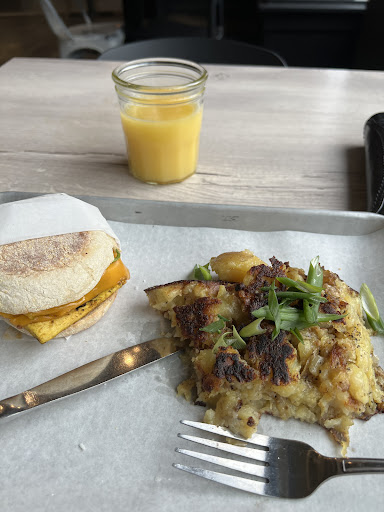 The breakfast sammie was the PERFECT portion on an English muffin. The sauce was a bit spicy, so expect a lil kick! No need for extra condiments like ketchup, the vegan cheese and tofu have tons of flavor.