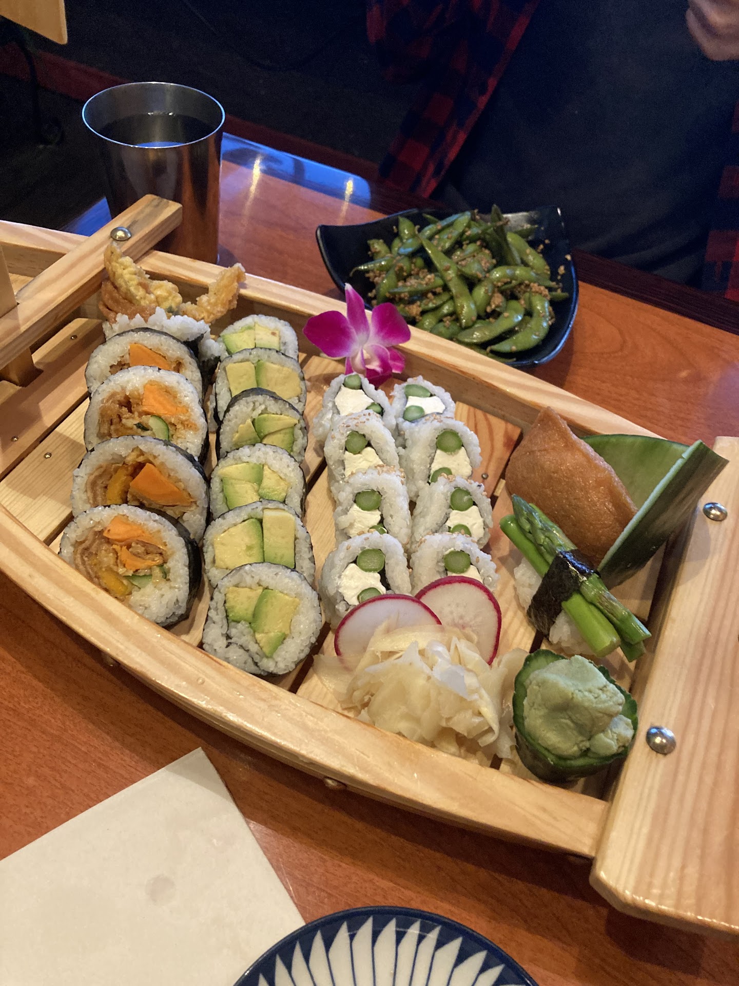 After ordering, it took about 30 minutes to receive our first roll, which a different server attempted to give to another table. The next rolls came quickly enough while the couple who were seated a couple minutes after us, still hadn’t received anything. The Ocean Roll was lacking with only 6 pieces for $16. The nigiri plate with the California roll was good, nothing special.