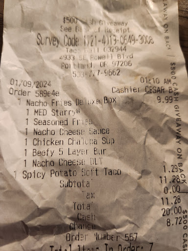 Read moreSaw new self order kiosk when I walked in. Used it to order. Once done placing my order I had the option to pay via credit card or cash. I chose cash. Then was directed to take my cash to the cashier. I waited for several minutes with no one greeting me. Once I was greeted by a tall younger gentleman and told him I was paying for an order I placed in the kiosk he didn’t know how to get to it. Went away from the counter and asked for help and no one had an answer. So then he went to get a lady she cane up and asked what she could help with like she hadn’t been informed of the situation. I told her I ordered on the kiosk and chose the option to pay by cash. She looked at me and said what was your order. I said I placed on the kiosk. She said it was there. And she seemed very accepting that my order wasn’t in the system. I then said if cash payment is t an option then it shouldn’t be in the kiosk. At that point there were more customers so I gave her my order and Cash payment. I then went to the restroom where there was no toilet paper and the sink faucet was completely loose from the sink. This was a very un happy visit and I will be sure to take my business to the 82nd and Johnson creek location or leave Taco Bell all together and support a local Mexican place that can provide me with a better experience. I have lived in this area a long time and this location has always had its struggles! For heavens sakes your missing out on opportunity to treat customers better and get this place full again. If I had to guess people go through your drive thru here more then inside - maybe just close the dine in and focus on drive through until it can be operated...