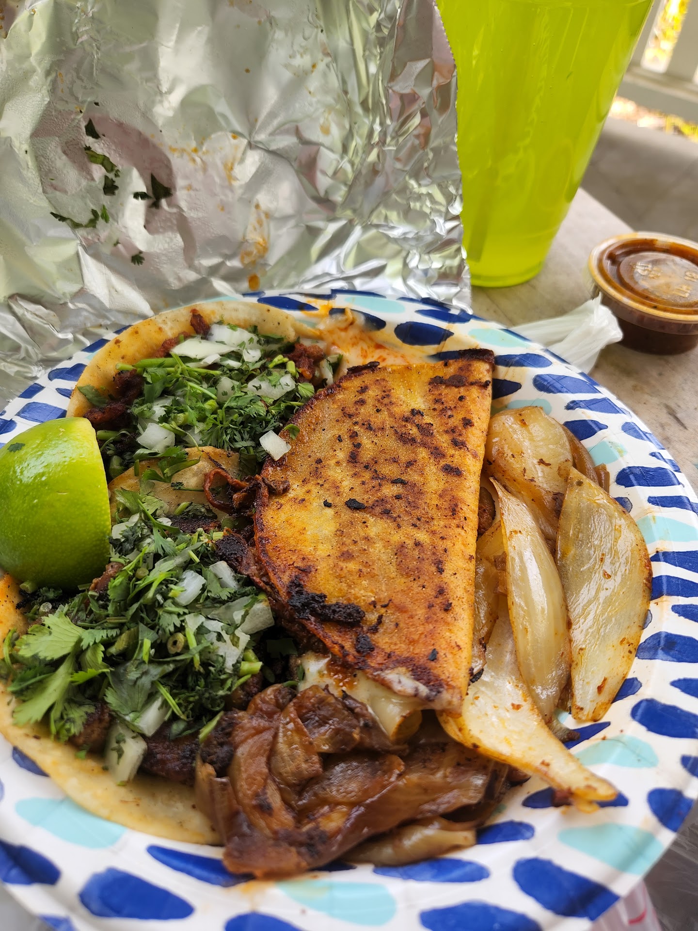 Read moreNot only did this spot pass the vibe check upon first walking under their tent, the classic mexi jams were playing and they had the salsa assortment and the caramelized onions on the grill, but they delivered on the flavor. I settled on a quesibirria, one al pastor taco, and one tripas taco (extra crispy, iykyk) and a cooling cucumber agua fresca. The service was friendly and welcoming, and fast. There's outdoor seating, mostly under cover and shaded. Parking can be tricky since they're right off Foster but I found a spot on 86th, around the corner. I'm telling all my friends about this place and I'll definitely be...