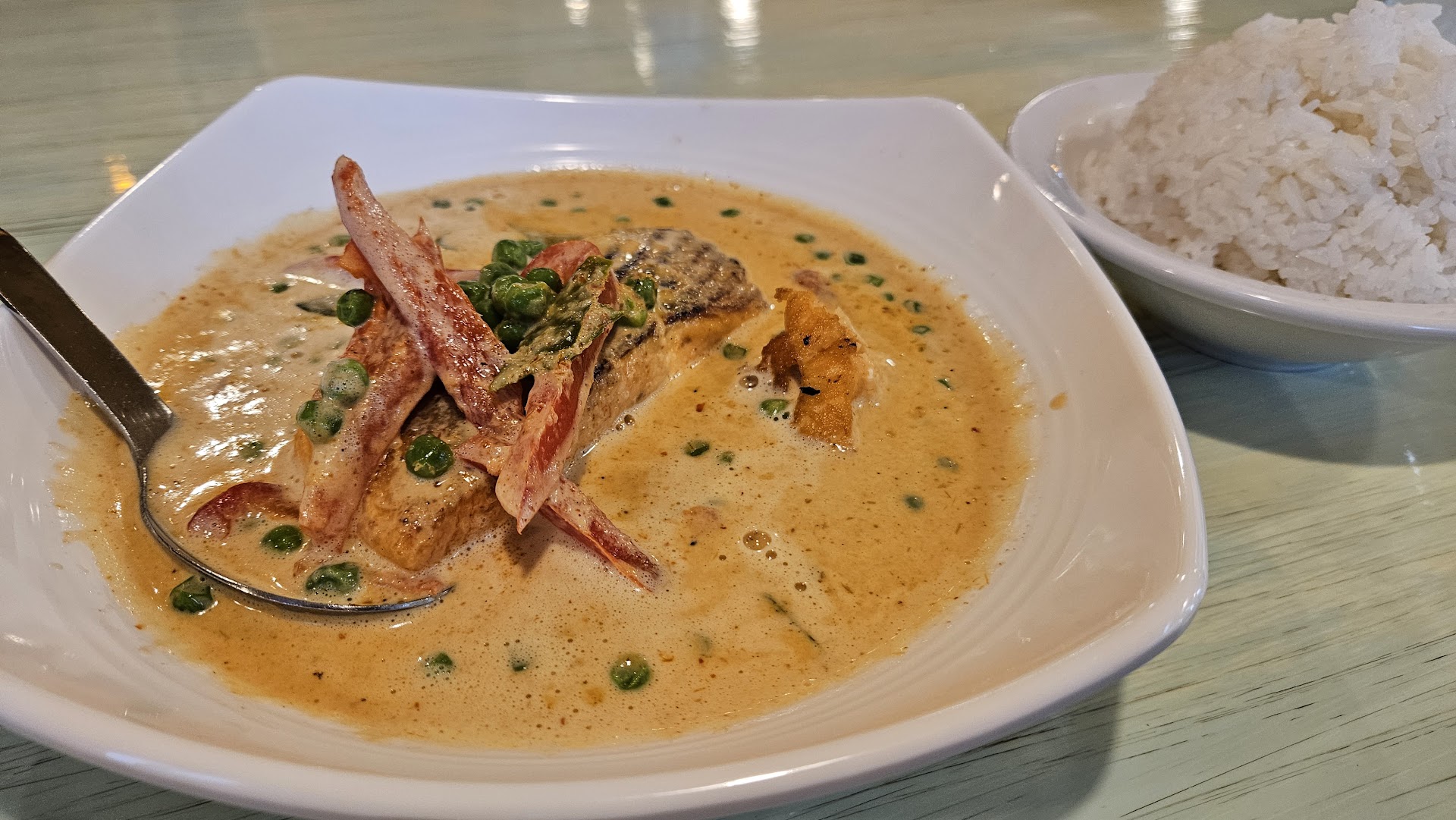 Read moreOff the charts food quality, service, awesome portions, and really nice space. This is my favorite Thai place in town now! I got the gaeng panang salmon, which was a super juicy perfectly cooked salmon fillet surrounded by an awesome red coconut curry with red bell peppers and green peas, served with rice. One order was enough to fill me to the brim even though I was really hungry! I also got to-go the pad see ew and Thai tea ice cream (made by them!) And it was all to die for! Can't wait to try the crab Thai chowder next time. Definitely bringing my crew here (nice place for groups), they serve my favorite cider and have great vegan, gf, meat, and seafood options. Very friendly thai family run business,...