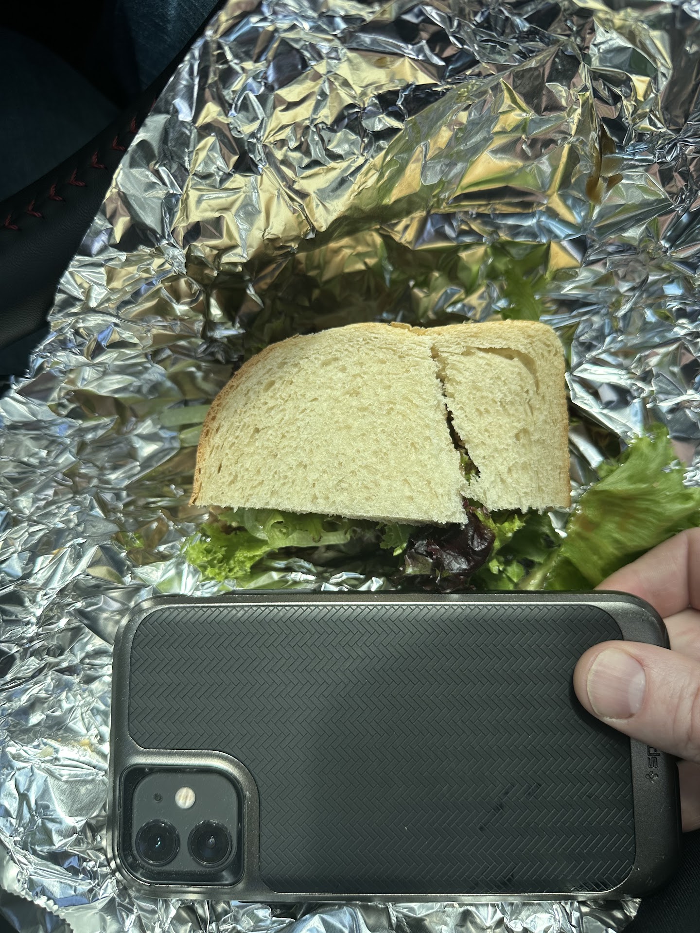 — — The prices are getting silly. I paid $8 for the sandwich in this photo. Half a sandwich on sourdough. As you can see, it is considerably smaller than an iPhone. And what happened to the chips? I get that prices have risen across the board, but shrinkflation has really done a number on this place.. — —
