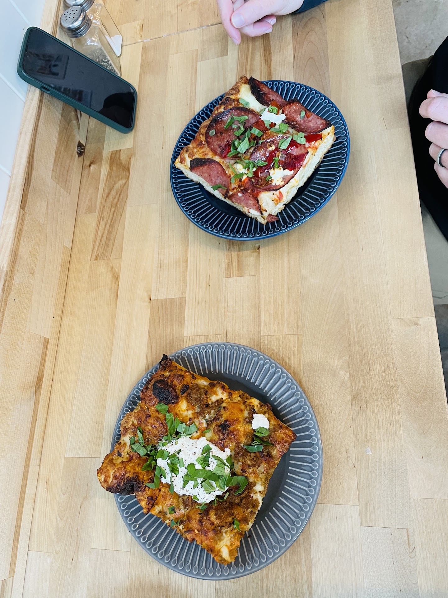 I stopped at this place for lunch on a beautiful Saturday afternoon. I've been wanting to try it for a while and boy it did not disappoint! The place is bright inside with a lot of cute art on the walls and multiple seating options. I loved that I could see all the foccacia options on display before ordering. The variety made it hard to choose because they all looked so good. We settled on sausage and leek and mushroom with sunflower pesto. We got them to go because we were planning to go to a park but decided to eat it for convenience. They provided forks, knives, and napkins at the table.