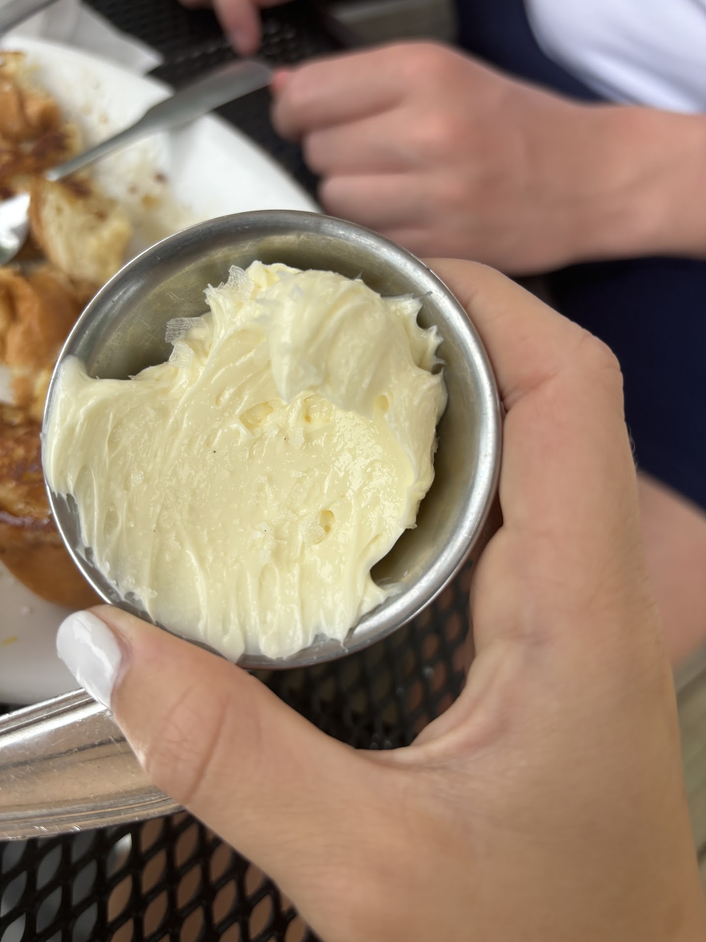 Read moreWe came for brunch about a week ago. We sat outside and received menus. Everything was going okay. Waitress seemed a bit grumpy but nothing too bad. When we ordered, I had a few questions about the menu. I made a modification and ordered a salad and a side of fruit. I asked the waitress about dressings for the salad and she had no clue. My boyfriend ordered the brioche French toast (which btw is crazy overpriced and is listed as cheaper online). He requested strawberries on top. The food came in a reasonable time, however, I never received my side of fruit. The whipped butter wasn’t on the plate, despite being advertised on the menu. The strawberries were not on the dish, either. The French toast was really underwhelming. My boyfriend asked the waitress about the whipped butter to which she replied, “oh, you want the butter?” As if the butter wasn’t included with the dish on the menu, even though it explicitly lists it. She stormed off from our table and aggressively placed the butter. Still, never got the fruit. The waitress dropped off the check. When she came back to retrieve it, my boyfriend asked for another minute with the check as we were still getting out the cash. The waitress dramatically ROLLED HER EYES at him. Once again, she stormed off. According to the receipt, our waitresses name was Julianna. We left our table, after paying, and started walking towards our car. I glanced back at her as she was picking up the receipt. She looked directly at me with this spiteful look in her eyes and made another eye roll gesture. I will add that we were not charged for the side of fruit, thankfully. Crazy bad experience that I wish we never had. Besides all this, look at what you get for your money. Also, much of the salad leaves were browning. See the photo of the butter they served us. The photo of the butter was totally...