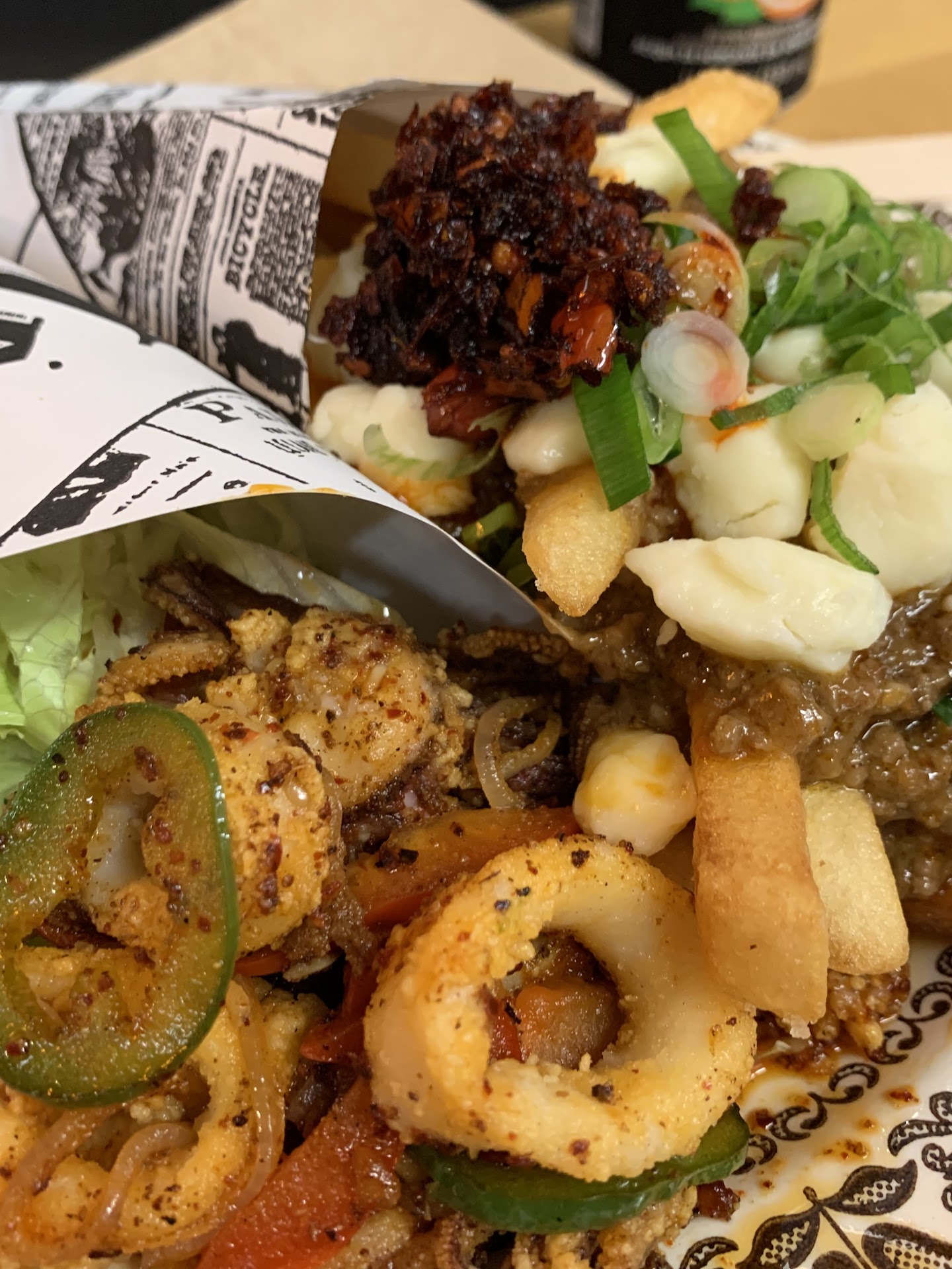 I came to The Frying Dutchman during the lunch rush and couldn’t decide between the salt & pepper calamari and the mapo poutine. Honestly though, the entire menu looked so creative and mouthwatering that it took me several minutes to narrow down what I wanted. Fresh Maine potatoes? Housemade sauces to go with everything like classic Dutch and Thai red curry mayos? Korean ramen cheese dogs? Sign me up. I was so indecisive that I ended up getting both dishes, and boy let me tell ya…
