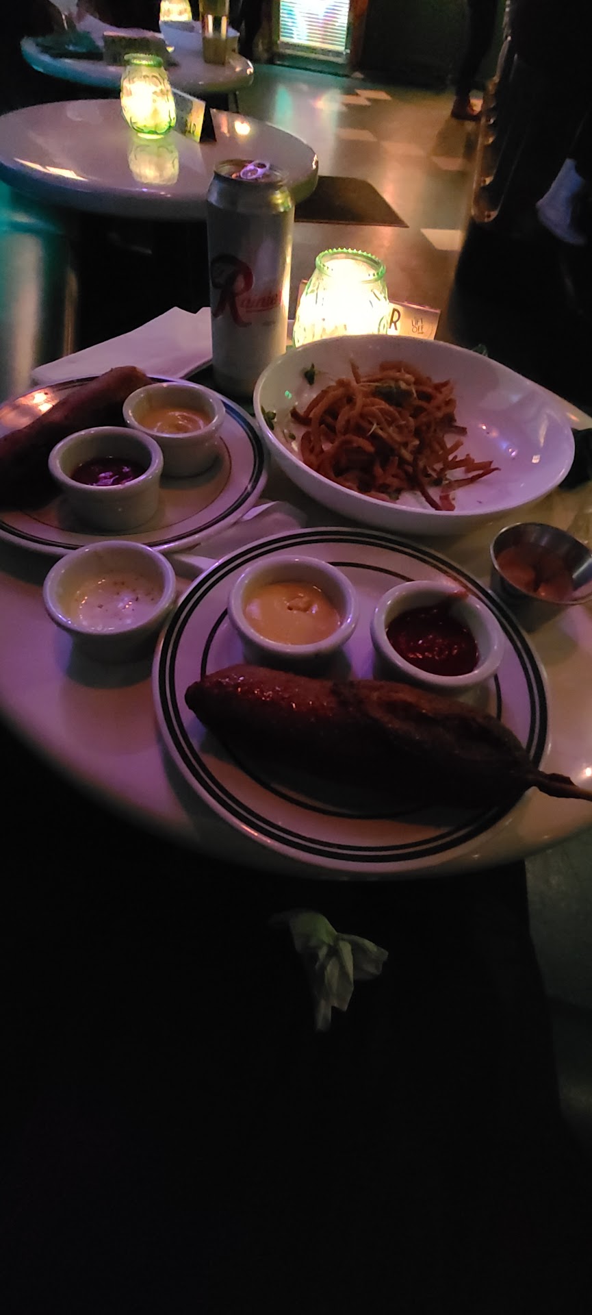 The vibe is absolutely perfect for the location and size of this place. Dark, but not too dark, great food, an unpretentious laid back crowd, and super friendly bartenders and staff. The interior feels exactly like your hip grandmother's basement, with vintage "space age" fixtures and decor, and the theme continues to the ceiling which is painted a darker blue to make you feel like you're truly about to lift off into outer space. Lots of benches/one-sided booths line the walls for plenty of seating, and a handful wrap around for larger parties. Food and drink are fantastic as well - my group of friends actually started and ended a night here because we wanted another order of the zucchini and red pepper fritters! We also ordered a fried pie, the relish plate, and the ricotta dumplings, all of which were top notch. I do have to knock a star off for two reasons: the night we were there the HVAC was on the fritz (one of the staff kept having to hold the front door open to let in some cool air), and the dining area that's set down a couple steps from the bar is incredibly echoey when filled with people, making it impossible to hear the person...
