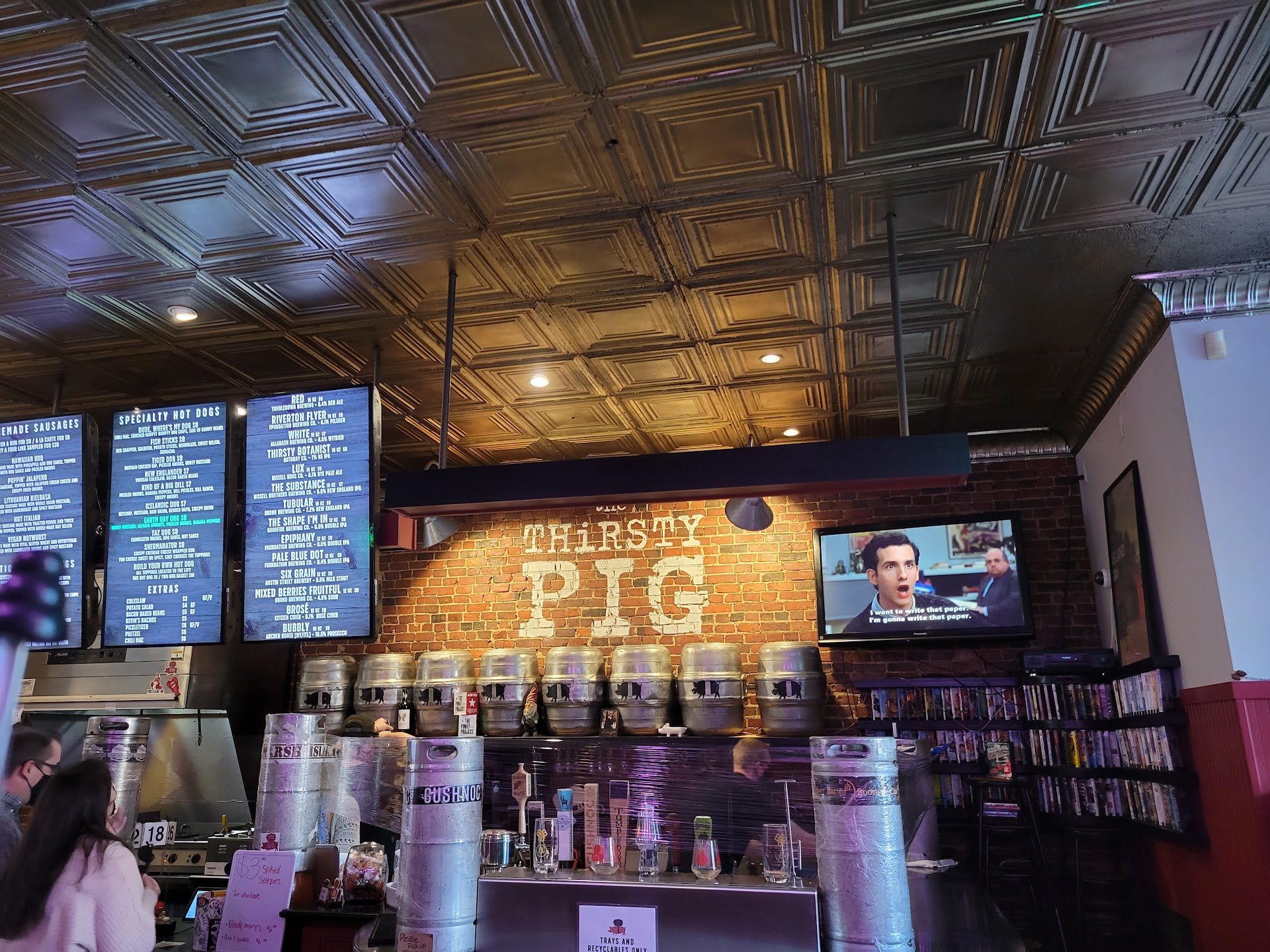 I went in with my partner and our dog on the weekend to try this place. We had driven past a few times, and as people new to the area, we wanted to try local food before chain food. We went in, almost immediately, a guy came from behind the counter, pointing at us, saying āthat dog canāt be in hereā. She was being held in the arms of my partner, not even on the ground. I responded āweāre going to take her outsideā (per their website dogs are allowed in the outside pavement area), and he responded āyou have to leave the restaurant and come in through the backā which is around the block. So we did. I was almost thrown off to not even want to eat here based on that rude interaction (in many cultures, pointing is rude). And in no way does it say on the website that people with dogs must enter through the back. It says that dogs are allowed on the pavement only. He didnāt say hi, welcome to the restaurant, etc. It was just the point and āthat dog canāt be in hereā. Iām honestly glad I had a moment to cool off after that because I could have reacted very differently if not. Ok. Anyway. On to the food. When ordering, I knew that I wanted to drink a beer. The menu is large and electronic above the cashier stand. I didnāt immediately recognize the beer list. When I asked the girl at the register, she gave a snarky response about it being right above the register and once again, pointed. We ordered two hot dogs, an appetizer of buffalo chicken dip, a beer on draft, and an orange soda, which came to almost $50. The food was completely meh. The best part about the hot dog was the Texas toast style bun. The chicken dip came with tortilla chips that broke so easily they could barely hold any of the dip. Nothing was so flavorful (other than the beer) that we will return. Itās really disappointing to have to leave a review like this, but after seeing otherās poor/similar experiences, it makes sense that this was our experience as well. Probably wonāt...