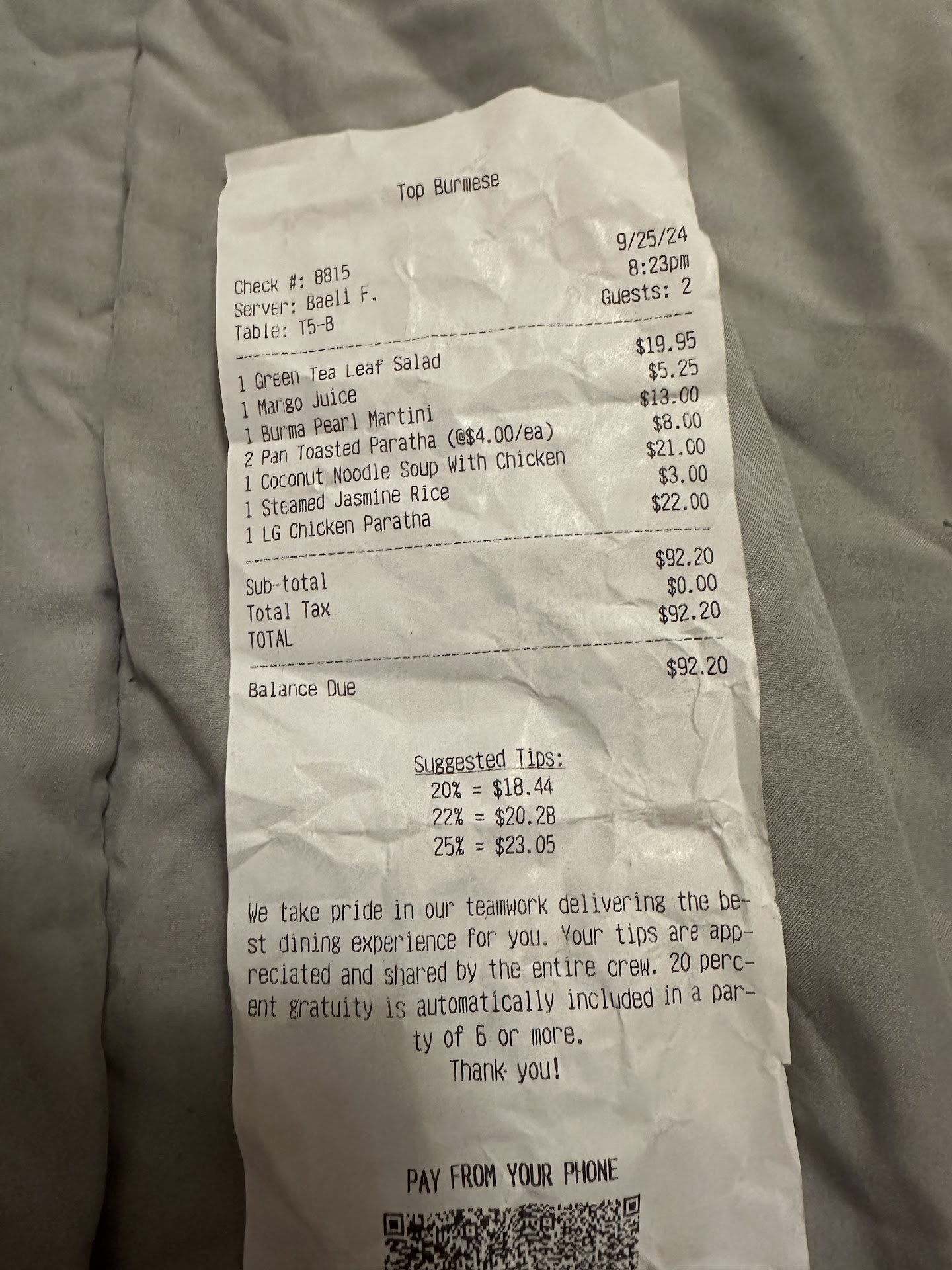 Read moreWe were there once before today a couple of weeks back and had a really nice meal. Today, however, the food was not good and very over-priced for what we received. Also, two of the dishes were not as described on the menu! One of the dishes was a combination starter that was described as having samosas and tofu tots and what we received, for $34 which is such a rip off was basically a platter of miniature puff pastries with only 3 of them with any filling. They are all tiny pieces to boot. 1/2 cup of French fries was also on the plate with 3 small containers of sauces two of which resembled hot sauce. How can they charge $34 for this? I didn't even realize the cost until my family member showed me the receipt as we were walking to the car - that's when I decided to review because we felt very ripped off. I actually called the restaurant afterward because I thought there had been a mistake on the $34 charge for the platter and the woman who I spoke to said she was a server and not in control of pricing and if I had a concern I would need to email top Burmese âsupport,â which I did and havenât heard one word back. The woman said âtheyâre air fried!âOkayâŚAnyway, weâre feeding the remainder of the mini empty all carb puff pastry platter to the birds. Iâve ordered samosa platters at other restaurants for $9-$11 and actually received delightful, substantial and delicious starters. They should be ashamed serving this and charging such an outlandish price. Probably the biggest rip off Iâve ever experienced in my long history of restaurant dining all over the planet. For my entree, I ordered a curry chicken noodle which had absolutely no chicken in it. My family member had an eggplant dish with coconut rice, she usually loves anything with eggplant and she said it was 'tasteless and bland.' The only thing that was decent this time was the tea leaf salad, although that tasted bitter and I would not recommend it. Another disappointment was getting their dessert cake to go, they did not include the whip cream and the serving size was literally half what I received on my last visit. A very disappointing experience. Unfortunately, we will not be returning. This restaurant lacks quality control and over-charges. I am thoroughly disappointed. See my itemized...