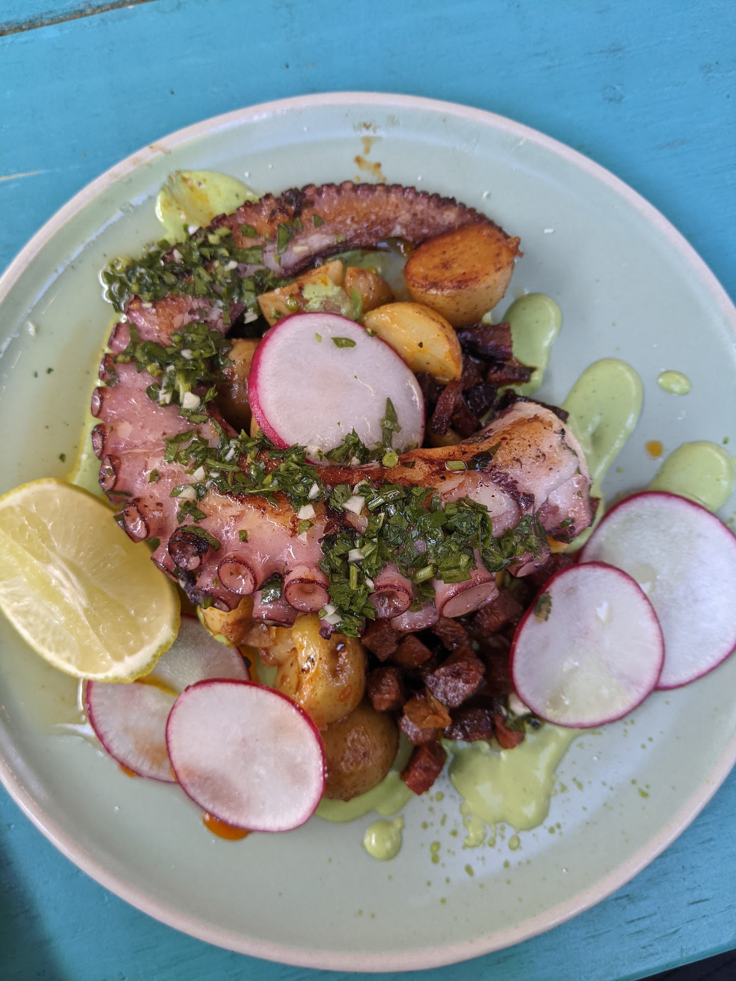 We ended up ordering the pulpo, los maduros con carne, and the tostada ahumada. Everything was fantastic! The pulpo came with chorizo and potatoes and was topped with a chimichurri and crema. The different flavors and textures worked so well together. Los maduros con carne was something I didn't know i needed in my life. The sweetness of the plantain topped with the savory pork - probably our favorite dish of the night. The tostada had the least wow factor in terms of presentation but it was very very tasty and we would definitely order it again. This was enough for food for my husband and i because we'd had a late lunch but, if you're hungry, I'd suggesting ordering another dish.