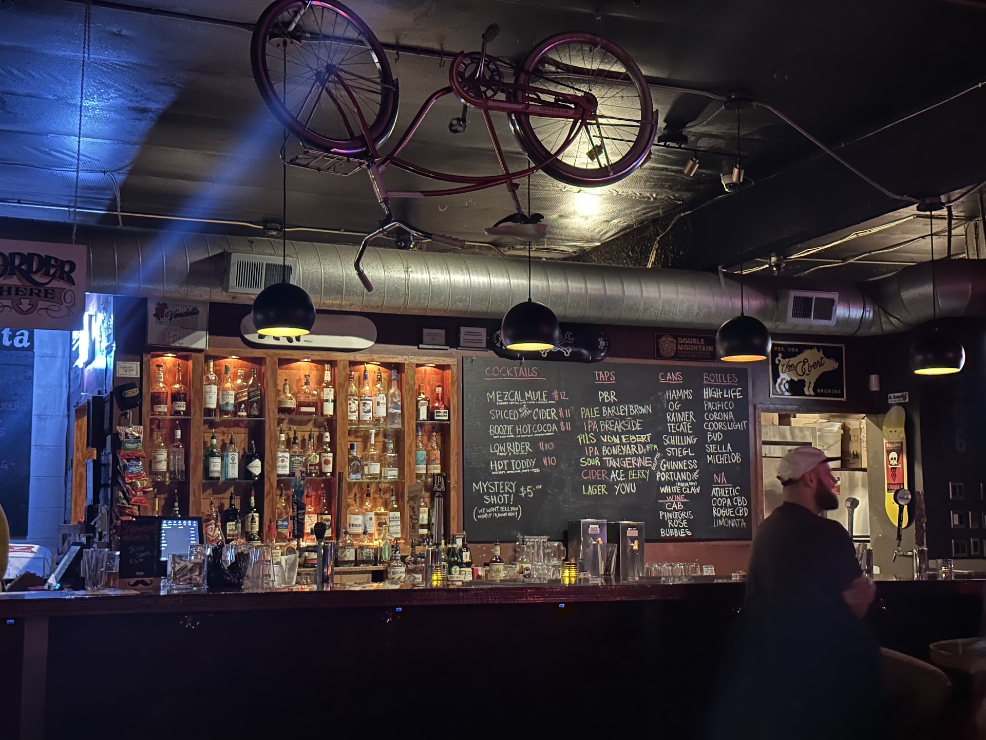 This is an interesting bar in a part of town that's been newly gentrified (ahem..."urban renewal", aka all the buildings near it are monolithic blocks with retail at street level). The space is nice and large, but there's not quite enough seating to fill it. A pool table and Big Buck Hunter are practically crammed into one corner (pool and video game players have to jostle for space with each other and with people at the tables nearby) while the other side has a few high tables with chairs in a sea of open space. There's a shuffleboard table along one wall with two pinball machines in the back corner, and a narrow patio out the back door. The overall ambience is typical Portland dark bar, with unidentifiable rockish/punkish music playing at a volume that you just barely need to shout over to be heard by the person sitting next to you. The staff are surprisingly friendly and attentive for being as pretty as they are. The beer list is as long as it should be for a bar in this city, and there is a fully stocked bar for cocktails and mixed drinks. The food menu has a fair amount of variety, with plenty of snacks and larger plates to have a full meal. I had the pulled pork sandwich, which was delicious. It came with a small bag of potato chips and a pickle. I saw many people ordering nachos which were piled high enough to share. The crowd, at least early on a Saturday night, was young-ish, pretty, and generally dressed as...