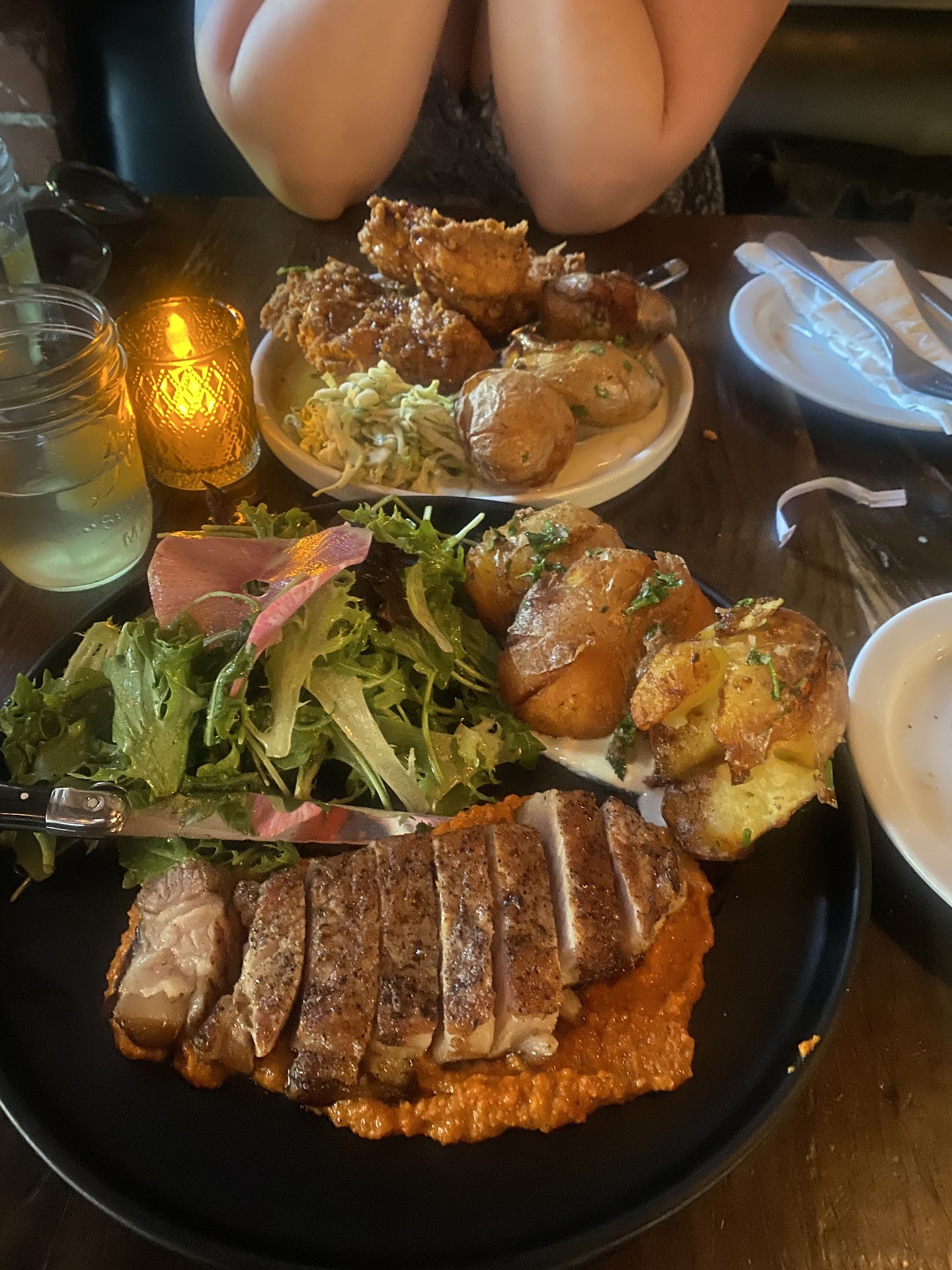 The waitress came over and cleared my wife’s food and then asked if I wanted a box. Then she asked to take my plate. I told her no I was still eating. I had wanted to order dessert, but she never asked us. Then she gave us the check quickly after that without a word. Then the hostess came right over after check was given and asked if I wanted a box. I got angry and told her “I am eating my dinner, go away.” What the heck? I got the $26 pork, the Japanese Lager, and no respect. It seems to me they were trying to turn our table. The table next to us, that was there before us and after us, was never pressured to leave. And I really wanted the berry crisp. But after rude and ruder, I don’t think so. We found an ice cream place instead. Why...