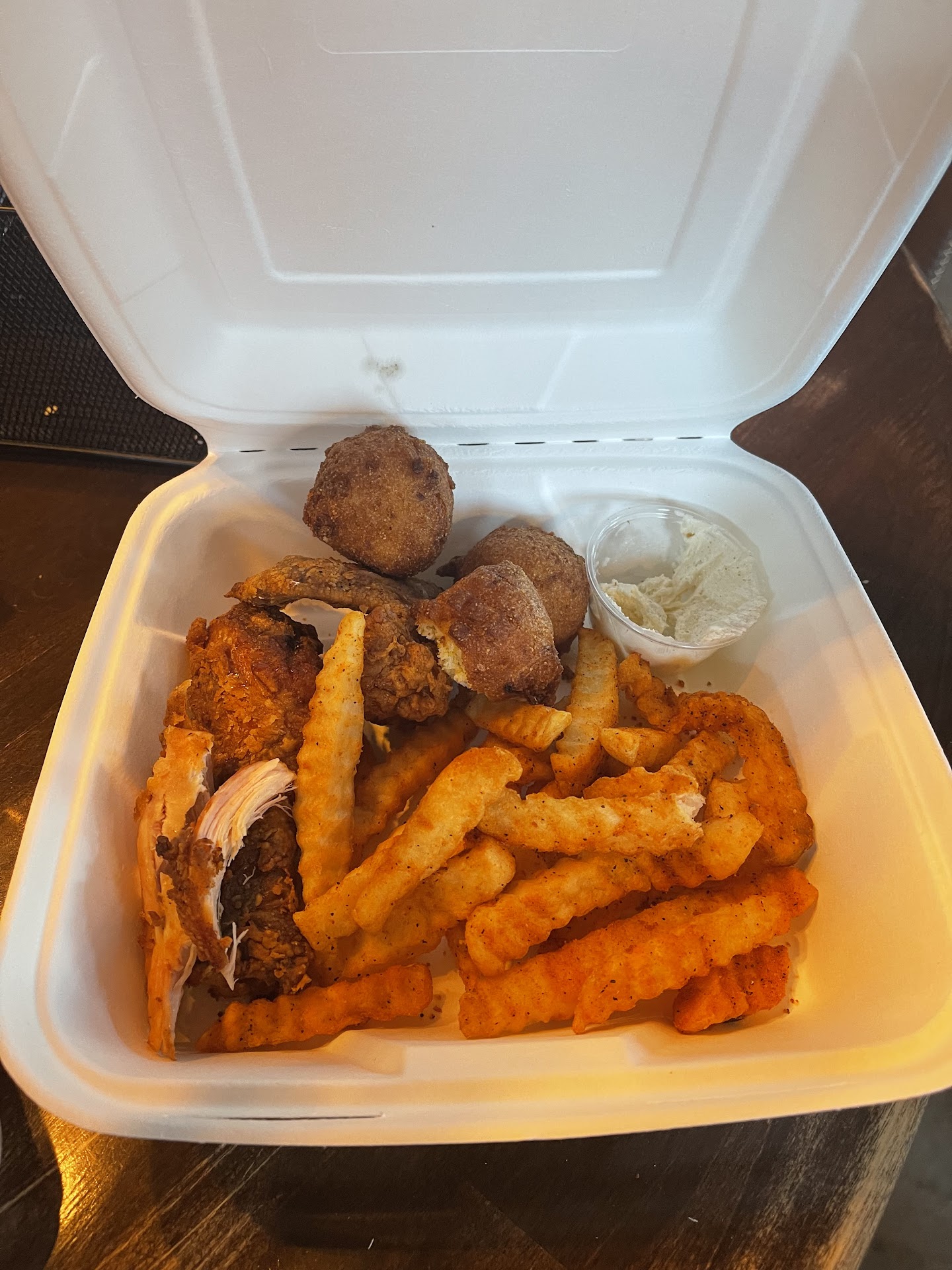 Ā Ā Ā Read moreIāve been here a few times. Love the atmosphere & the people & some (not all) of the food. First off, the hushpuppies are amazing!!! By far my favorite thing. Second fave is the fried shrimp. Itās awesome! Large meaty shrimp, cooked to perfection. The chicken sandwich is very very good! Chicken & waffles yummy!! The pulled pork is ok although hubby said it was rather tough. Pulled pork should be tender, not tough. Today I had the fried chicken, Iād been wanting to try this for a while & had high hopes. It was a big letdown Iām sorry to say. I probably shouldāve sent it back cuz as soon as I picked it up it looked very dark & quite dry. Dry is an understatement! Wow, I had to go get some ranch & soak it in that or it would be like sawdust. (breast meat) the thigh was better, dark meat is just more moist naturally. I will never order it again. I thought that maybe thatās just how they cook it, then I see someone walking by with the same meal I got with golden delicious looking, perfectly cooked fried chicken! That really irritated me as I knew mine was just a very overcooked batch. So in all $71. & we had overcooked dry chicken, tough pork & a good chicken sandwich & fantastic hushpuppies. Not a great deal. However in the past Iāve had the shrimp, twice & it is fantastic! The bbq dusted fries are really good as well. The cheese grits are terrible. Loaded with onion! I will be back as I like the atmosphere, outside seating with fire pits & lighting & the people there r super nice! Just a review to let others know whatās good & not so good. I personally donāt like spending $ & getting subpar food. Iām not very good about speaking up thoughā¦. I will stick to what I know is good here! I didnāt think to take a pic of my meal b4 I started eating. This is what I had left. U can see in the pic how incredibly dry...