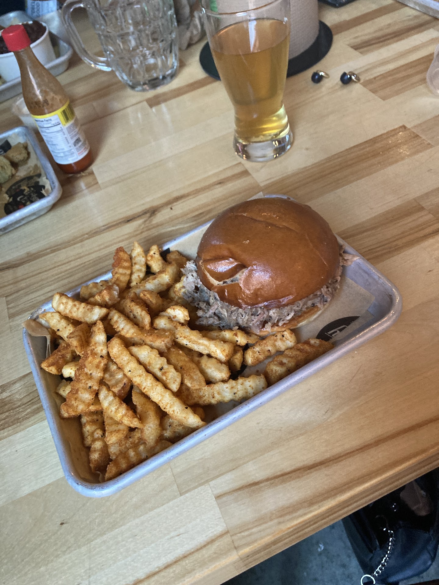 Read moreI’ve been here a few times. Love the atmosphere & the people & some (not all) of the food. First off, the hushpuppies are amazing!!! By far my favorite thing. Second fave is the fried shrimp. It’s awesome! Large meaty shrimp, cooked to perfection. The chicken sandwich is very very good! Chicken & waffles yummy!! The pulled pork is ok although hubby said it was rather tough. Pulled pork should be tender, not tough. Today I had the fried chicken, I’d been wanting to try this for a while & had high hopes. It was a big letdown I’m sorry to say. I probably should’ve sent it back cuz as soon as I picked it up it looked very dark & quite dry. Dry is an understatement! Wow, I had to go get some ranch & soak it in that or it would be like sawdust. (breast meat) the thigh was better, dark meat is just more moist naturally. I will never order it again. I thought that maybe that’s just how they cook it, then I see someone walking by with the same meal I got with golden delicious looking, perfectly cooked fried chicken! That really irritated me as I knew mine was just a very overcooked batch. So in all $71. & we had overcooked dry chicken, tough pork & a good chicken sandwich & fantastic hushpuppies. Not a great deal. However in the past I’ve had the shrimp, twice & it is fantastic! The bbq dusted fries are really good as well. The cheese grits are terrible. Loaded with onion! I will be back as I like the atmosphere, outside seating with fire pits & lighting & the people there r super nice! Just a review to let others know what’s good & not so good. I personally don’t like spending $ & getting subpar food. I’m not very good about speaking up though…. I will stick to what I know is good here! I didn’t think to take a pic of my meal b4 I started eating. This is what I had left. U can see in the pic how incredibly dry...