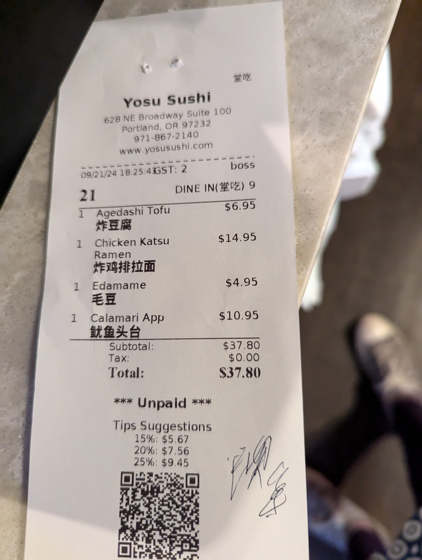 I wish I could leave Yosu Sushi a good review. My friend and I sat down to eat at 6 pm and ordered ramen, katsu chicken, agedashi tofu, a Hawaiian roll, and a spicy tuna roll. While my friend got her katsu chicken and soup, I was left waiting 1 hour for my food. The waitress did bring us appetizers we NEVER asked for with my friend's food like edamame and calamari. After flagging the waitress down we asked how much longer it would take for the rolls and she told us 10-15 minutes. I was still really hungry after eating some but not all the appetizers she brought us without asking so decided to wait 10 minutes. We canceled our order at 7:10 pm and almost left after paying when I checked our receipt and saw that she did charge us $16 for appetizers we didn't want. I would have been okay paying that price if she had been honest about wait times and apologized for the mistakes on our order. However, when I requested a refund she haggled and continued to waste 15 minutes of my time. She tried to appease us by giving us free soda! She offered us two sprites and two coca colas, but that was an obvious insult to our intelligence after messing up our order and claiming we got what we wanted. Finally, the sushi chef noticed us arguing with the waitress and took a look at my receipt and agreed to refund us for the appetizers. I really hate seeming entitled, but I have never left a restaurant feeling so insulted and hungry before. I love sushi and I wanted to love You sushi, but after driving from Eugene for a concert I was so let down and disappointed. I would have been okay going elsewhere if I didn't have an event to go to at 8 pm. Sidenote: we also witness another pair cancel their order and we saw two friends dine and dash. It's obvious they lack in customer service. I decided to attach a photo of the...
