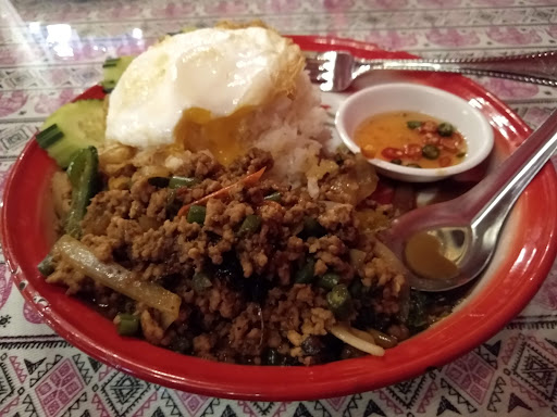 I tried the same dish as on my first and second visits, the Pad Kra Pao (Spicy Basil) and my wife had Green Curry Chicken with sticky rice, she had heat level 2, mine was heat level 3. Mine was perfectly spicy for my needs. My wife's was a bit spicy for her, but she's been caring for her elderly father over the past two years who can only tolerate mild to bland spices.