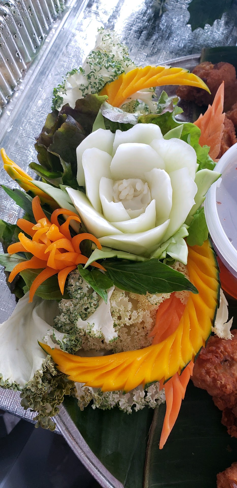 It was so far from that. They delivered works of art in displays of hand-carved vegetables layered in and amongst the Pad Thai and other menu items we ordered. We were BLOWN AWAY at the beauty and intricacy of how they painstakingly created these platters. I had no idea that they did anything like this.
