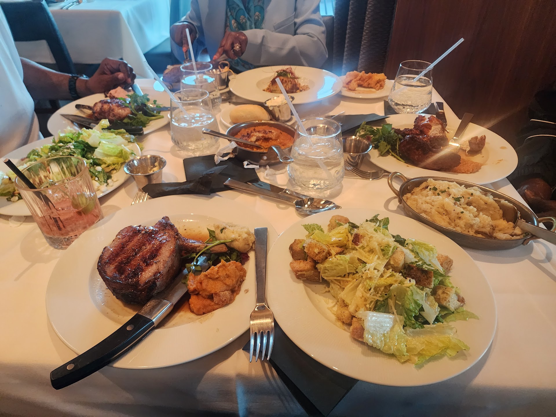 Read moreWe were greeted by two hostess who immediately sat us. Our hostess and server immediately poured nice ice cold water and smiles. Our server, Kiara, was so pleasant and helpful for our entire visit! Kiara, offered some drink suggestions based on a few questions she asked us. She gathered our drinks and immediately came back with them. She asked if this was our first time visiting and it was. She made a few recommendations to us for appetizers and dinner just by simply listening when we were talking. I loved the fact that she has tried everything on the menu and was able to offer complimentary meal pairings. Our appetizers and main course entrees were not spaced too far apart. That is pet peeve of mines! For appetizers we had the calamari and lamb chops. Hats off to the chef as he did not overcook them at all. There is a sauce prepared with the chops that put a little zing at the end of the taste to the chop. The calamari was fresh as well and the sauce paired with it was great. For the main entree there was one crab cake from the compliment section of menu. That one crab cake was so tall and thick full of crab meat! The chicken confit was superb!!! My grandfather is very particular about his chicken and it passed his test with flying colors. The fat from the chicken was very flavorful. Also, we had the pork chops which was good and not overcooked at all. The only request I have is maybe offer a side of onions or cooked green apple to complement the chop. The sides are large enough to split four ways and still have leftovers. The Sweet Potato Praline has notes of a sweet potato pie. It was served hot and very fragrant. The garlic mashed potatoes shocked me with the amount of garlic at the end of the taste pallet it presented with hints of melted cheese. This dish was clearly well planned. We also tried the table side Chopped Salad and the Caesar salad. Both are great options and it was noted that they make their own croutons in-house!