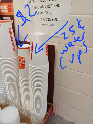 $2 tap water! 😡 Melissa charged my husband $2 for tap water. My kids told me what happened so I went up there after church. A nice lady who works at Burger King told me that Melissa charges customers $2 for tap water eventhough she can use the water cup and charge 25 cents. My husband didn't ask for a big cup, just a cup of water. The nice lady gave me a bottle of water because i told her that on the screen it actually said "bottled water" but my husband never even got a bottle. I really appreciate her doing that. It wasn't a mistake...Melissa habitually rings it up as bottled water and gives tap water in a big cup to customers. The nice lady also gave me the owners name. I'm torn because I've gone to this BK since 2003 and only had a problem once or twice at max. So today was very irritating. Melissa got my husband's order wrong at first, which is ok because we all make honest mistakes but then she had an attitude when my husband told her about the error. When my husband asked for the new total, she said $8.36. My husband got a 2 for $5. So my husband asked her why the total was so high and whether the tap water was $2. She never answered him but kept repeating $8.36 over and over again. Charging a customer $1.75 more than necessary is mean-spirited. The nice lady said that Melissa has worked for BK for many years but transferred over there and started charging more for tap water than what a bottle water costs. Noone else does that she says. With everything going up in price, it's very weird for someone in customer service to rip a customer off and for no reason. I took a Pic of the water cups--they are right there beside the other cups! My husband works hard to provide for his family and paying extra for nothing is...