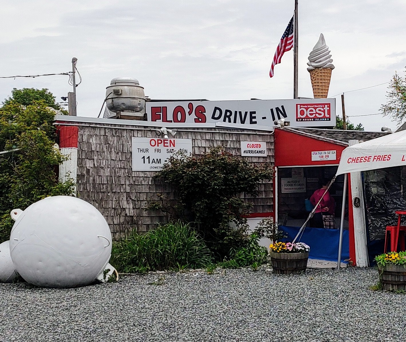 What can I say about Flo's? Lots!! If you've never eaten here your missing out on fresh food made to order while you wait & while you wait you'll enjoy the view! Flo's is located directly on the water of the Sakonnet River in the heart of Island Park Portsmouth RI. This establishment has weathered multiple hurricanes of years ago 38 & 54 which left this building submerged w/in the Sakonnet River. At 1 time there was a water level indicator on the front of Flo's but I noticed during my visit last wk that marker no longer stands. I have to say I was disappointed to see it had been removed so I asked the cashier unfortunately that employee had no idea what I was referring to. Now on to the food! Clam cakes are the best! They were the perfect golden brown, portion size was generous, not dripping in grease & deep fried to perfection lightly crispy. The menu is extensive everything from hot dogs, to the most expensive item is the large order of fried clams $$$$ over $30.00 & your only getting clams! This is not a sit down inside restaurant, its stand in line outside & eat at picnic tables, inside your car or on river wall or benches across the street. My favorite time to eat here is lunch, no wait! Enjoy the...