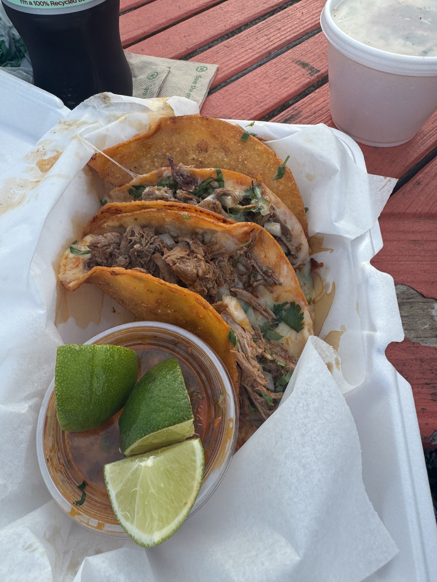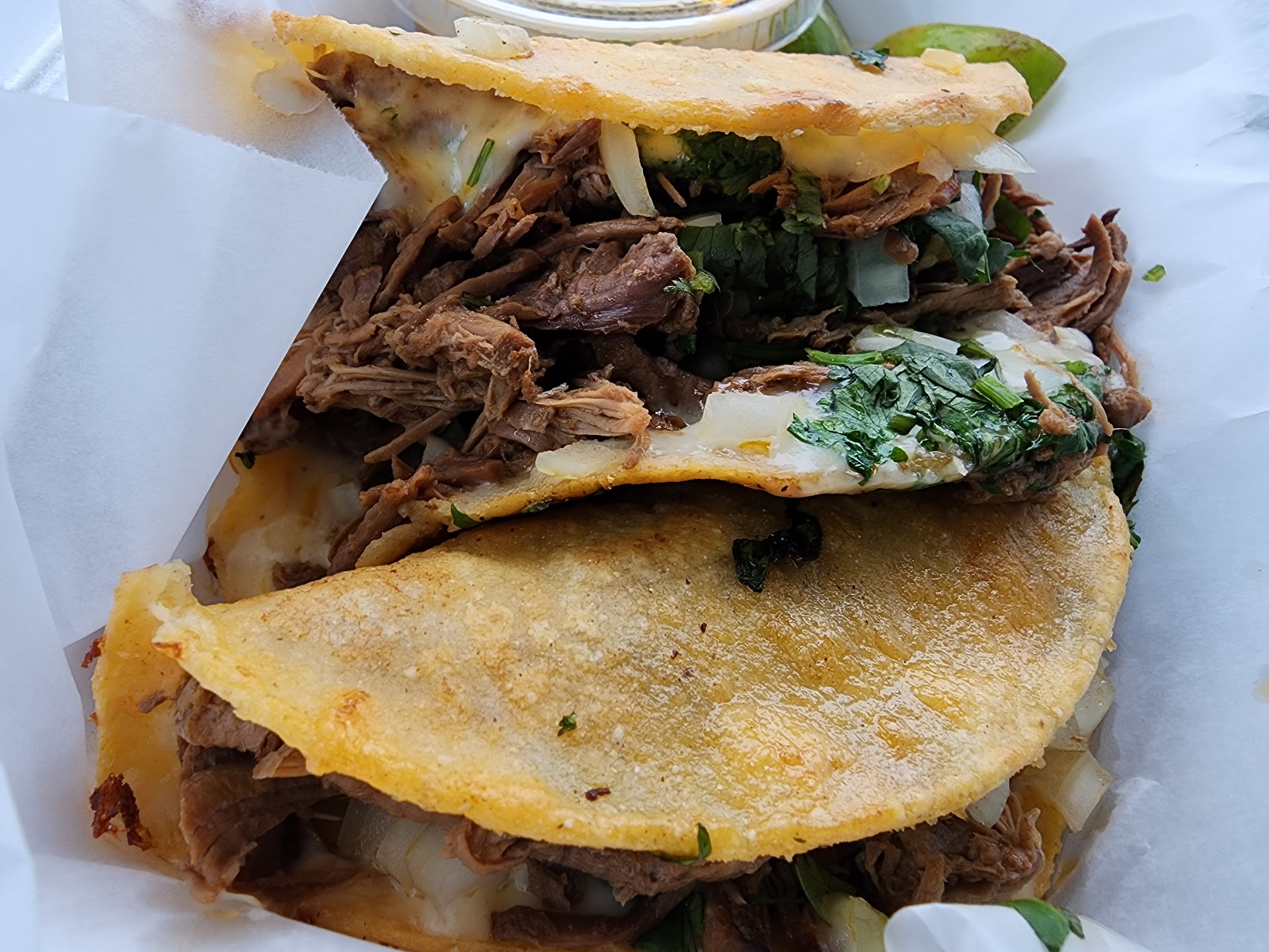 The birria taco meat was so tender and delicious, but for me the street corn in a cup was decent, although I have certainly had better elsewhere. The restaurant is a bit small and looks like it primarily operates as a casual takeout establishment although they do have tables and barstools for sit in customers as well as tables and chairs outside. Overall, an okay place for Mexican...