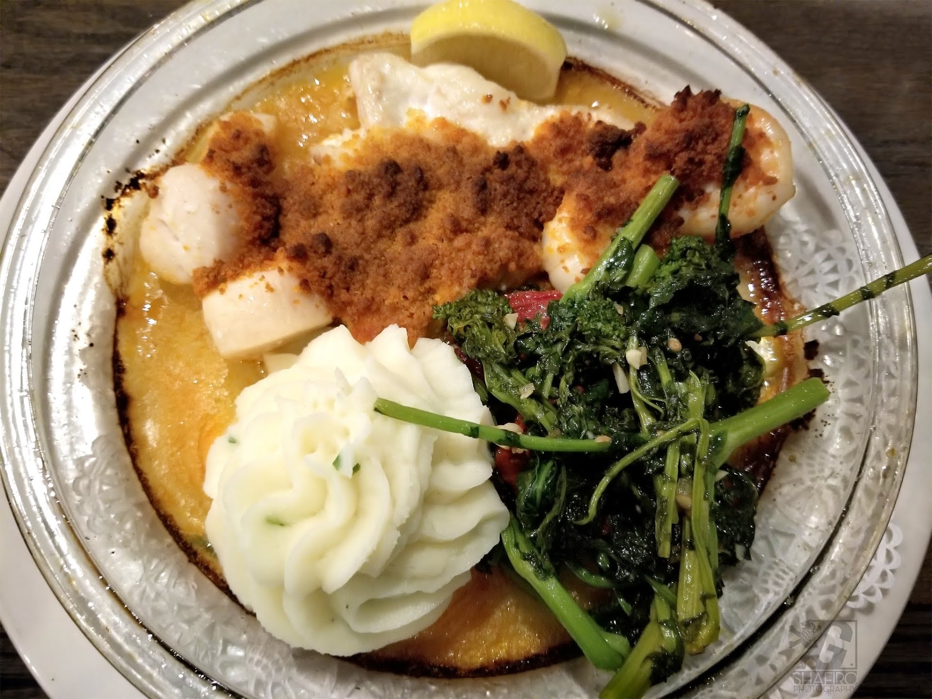(2)The New England Baked Seafood Trio, was not how should I say something you would write back home about. The haddock, was well cooked but everything else like the scallops, and shrimp were overcooked and dry, which was very upsetting. The vegetables that it was served with (bitter greens / dandelion greens and chicory Puntarelle ) also did not mix very well with the taste of the whole dish. To the point, were the server came by and said yes, that is a bad pairing why dont I get you some asparagus. Now I was going to give this restaurant a 2.5 stars because of this dish. However, the server because of how nice she was and how well she handled the situation brought this place back to a 4.5