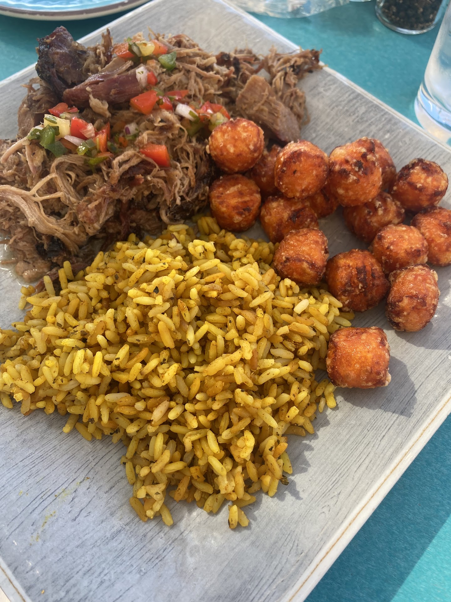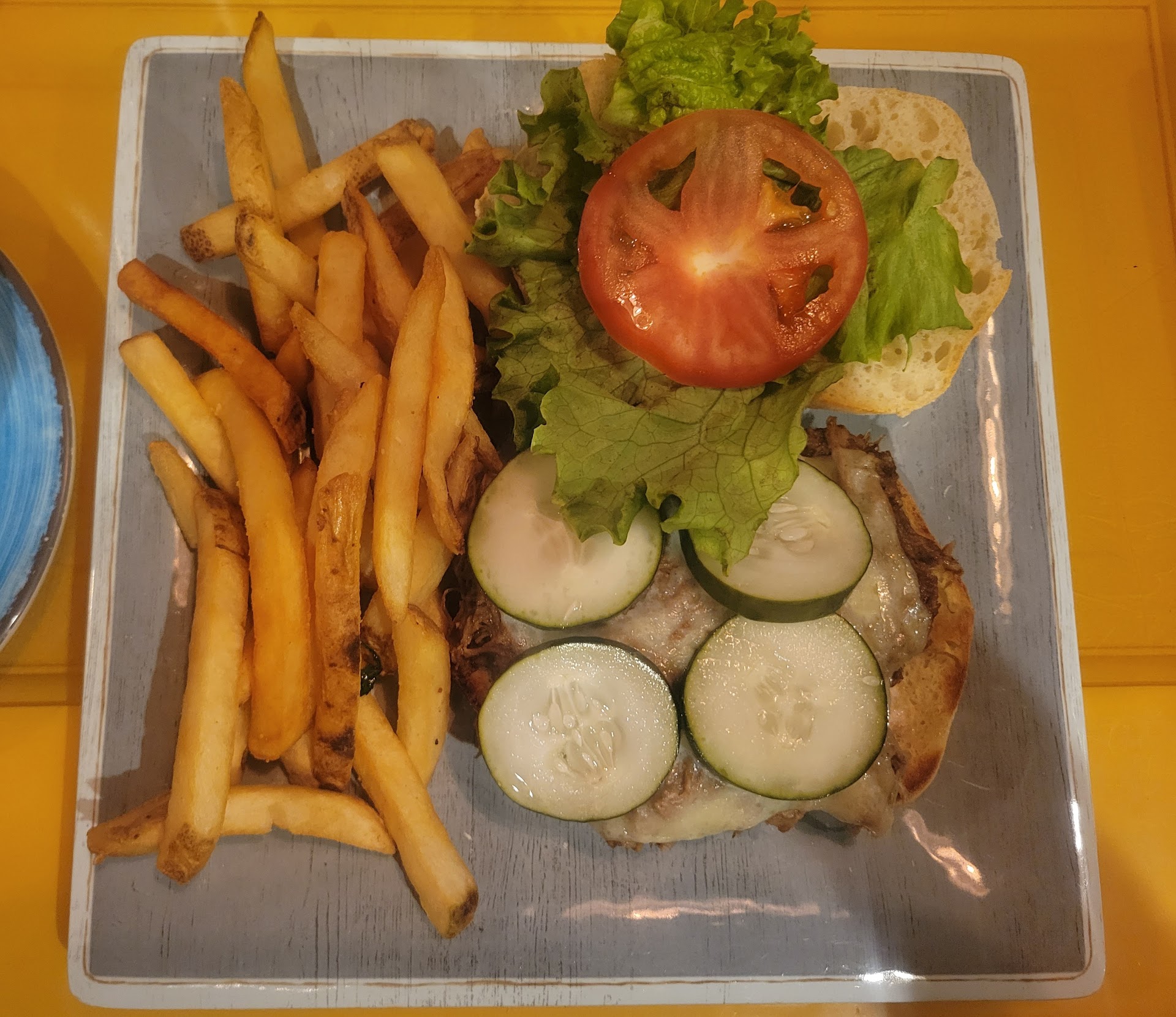 The food: Portions are very small yet plates are on the pricey side. We started with 2 very small and overpriced stuffies. We enjoyed them very much but they were on the spicy side, which I liked but my wife less so. $17 for a small over fried filet with a hand full of fries. The filet was so overdone and dry that my wife needed to use her knife to get through it. I opted for āThe Platterā which was anything but!.... the ādebrisā as they call it was good but really, itās just shredded pot roast and again, the portion is small. The tots were nice but the Mac and cheese was dry and rubbery like day old Mac that was reheated in a microwave. Not creamy or tender in the least.