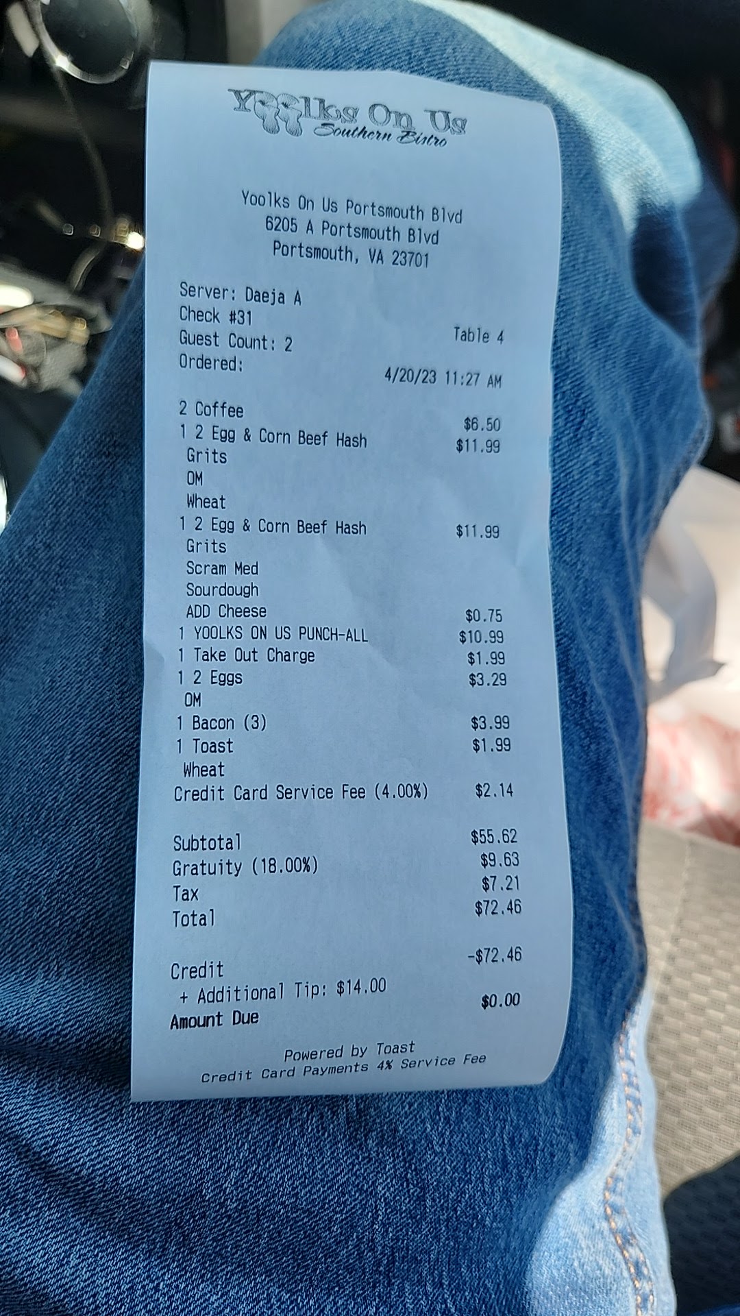 Ate at Yolks on Us in Portsmouth today for breakfast. It was barely edible. I asked for no powdered sugar on the pancakes & got pancakes with it. They took them back & tried to scrape it off & then flipped the pancake upside down & gave them back to me. I listened to the waitress & chef discuss it because he didn't want to remake them. The sausage gravy had no flavor. The homestyle potatoes were edible but no seasoning (not even salt or pepper), eggs over ready were liquidy whites that were still cold. Bacon wasn't bad. Be aware, you are automatically charged 16% gratuity! Yes, it's posted on the door as you enter so you are aware. Wait staff nice when at your table, but their cell phones are important too & take priority. I had iced tea & was never offered a refill or able to get a refill, one your fix is on the table you have to distract the waitress from her cell phone if you need something. Added note, as I was getting up to depart I heard the waitress tell the chef that a lady had asked to have her order remade because it had an item in it that she said she was not able to eat and the chef said that was her problem. The lady tried to explain that the description on the menu did not list the item, very much like it did not say that their pancakes are coated with powdered sugar, the chef said again that was not his problem and she would just have to deal with it. Please avoid this place! While the waitresses are polite when they are talking to you the guy in the kitchen that cooks (at least today) is awful! We ate at this place because we looked at the other reviews and walked away extremely shocked that today's experience was nowhere like the others that have recently been posted. In olooking at the photos of the people that were posting a couple of them actually look like some of the staff that was in the restaurant while we were there, that makes me question if they are staff or if they are family because they look so much like the staff that was there today. I will often give places a second chance, but this one... never...