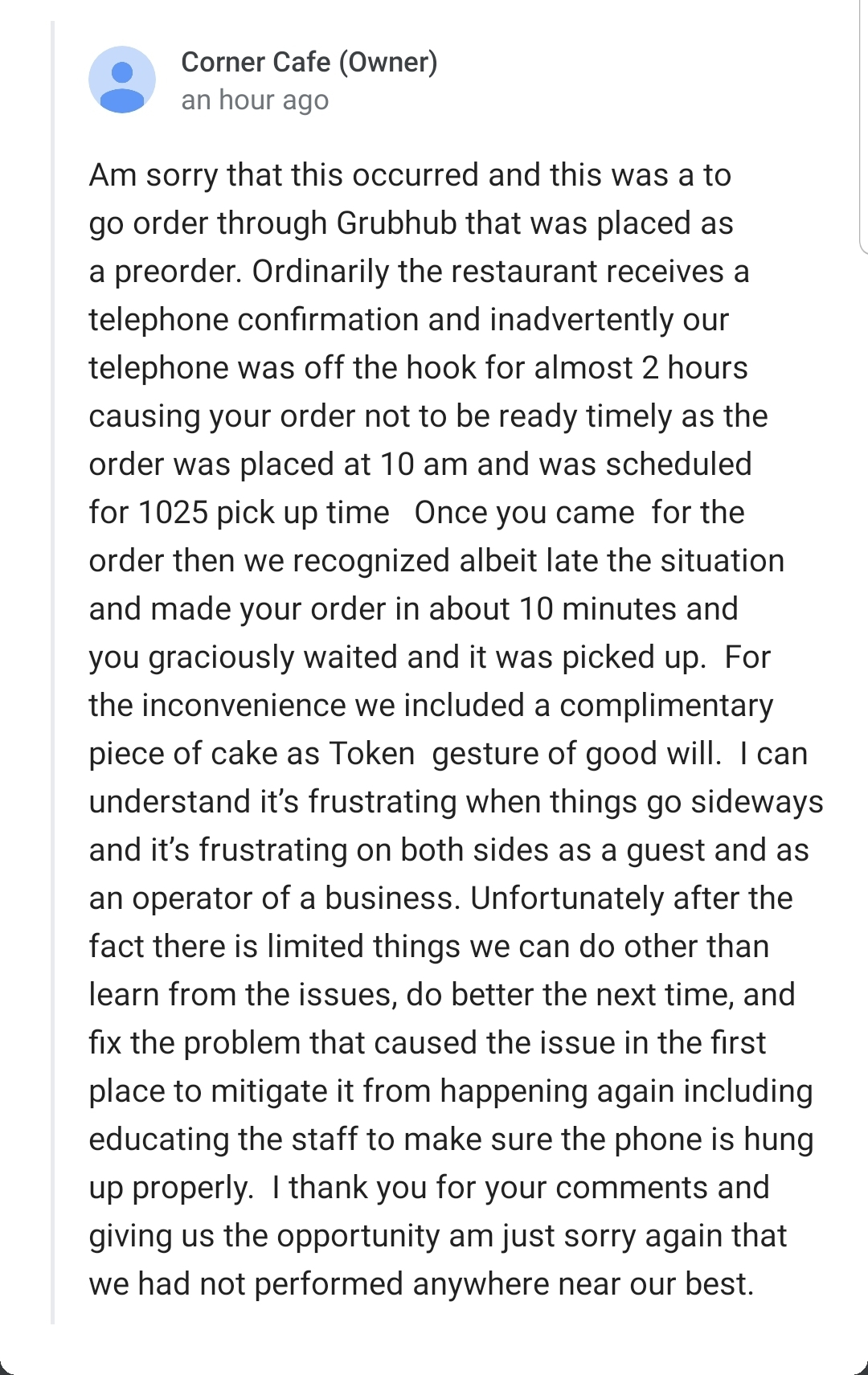 My friend is single she was asked to move from her table she was enjoying. She just finishing a meal. She was not there long. The place was not busy however, six people were waiting. The young man from the back and the waitress ( who my friend just tipped) asked her to move to the counter. This table mind you only seat four people. Also there are other available tables in the large room. Such a insult to move the very counter were in the passed my friend had to wait for 30 minutes to be served . Furthermore that same day a single man came in and was waited on right away. Truly I will share this public. I do not want anymore single ladies to be treated the same way. So that Harding working single woman may be respected and also enjoy spending their in a more respectable establishment. Good luck with all your great ideal about yourself. May your Christmas hold the same treatment to your daughter or wife should they want to go off alone into a similar store or resturant. My friend is great and special and deserves to be treated as such. Hay I want to clear up something here. Maybe you should leave people to enjoy there seat. Maybe Michael you should realize that what you did this morning at breakfast was not kind. An appeal to your lack of customer service is quite appropriate for a rude person. Why interrupt someone who has enjoyed breakfast at your restaurant? Why ask them to move at all when your place was empty. If she wanted to stay there all day and drink coffee she should be allowed to do so. But no you decided she had been there long enough. I would not shadow your door and I have eaten and spoken with you several times. I find your response shameful. Its low to repeat what your action forced someone to turn on you with. It does not show a character of stellar hostess but mean spiritedness. I do not care what my friend called you. No business should do what you did on a dead non busy Saturday. It kills your business. No kindness is seen by me to clear this up. No response or maybe I am sorry what can I do to make it right would have been proper. However, I know you well. Your workers bring you cold coffee. I hope they keep doing so. Until you figure out it been you all along. Just say I am sorry. It would not hurt to do so. Then never mention the other part as it makes you look bad. My friend would not...