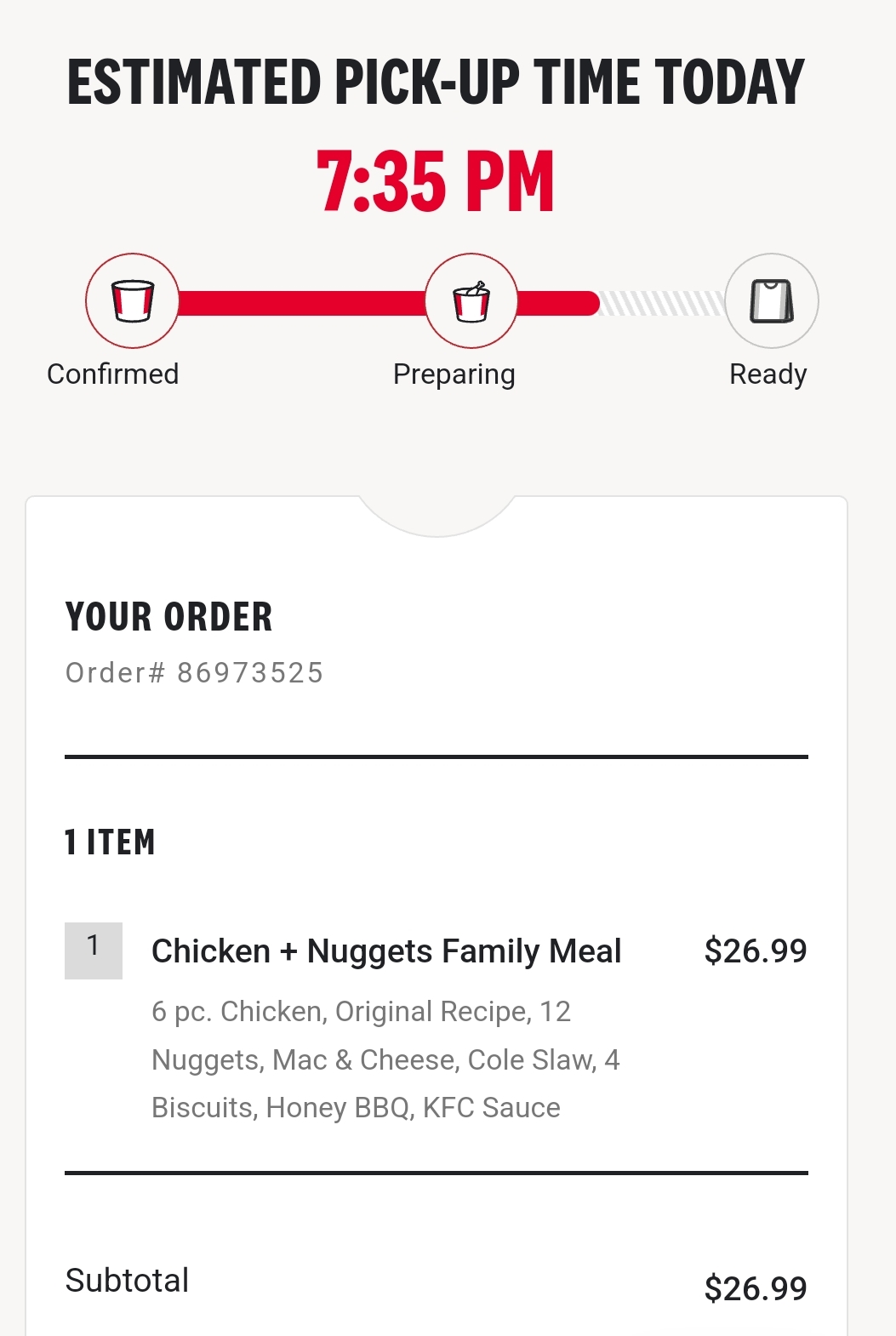 Read moreWe went to this KFC a couple days ago and ordered the 8 piece family meal. For $37.00!!!Way too expensive for very little food! We were told that they were sold out of Extra Crispy style at 5:03pm! Are they kidding me?? Isn't this a chicken restaurant? Sold out at 5:03pm?? The girl said we could wait 30 minutes for them to cook more. I changed my order to Original recipe instead and she told me she would have to check and see if they had enough to fill an 8 piece bucket. Which they did. What the heck have they been doing all day if they don't have any chicken ready for the dinner crowd that was lining up behind me in the drive thru?? Maybe some management might be a good idea. Seems to me that if you're a fried chicken restaurant, you should maybe have some ready for the dinnertime rush! We won't be making the drive back to this location just to be disappointed again. Adios KFC, Popeyes is right on the other side of...