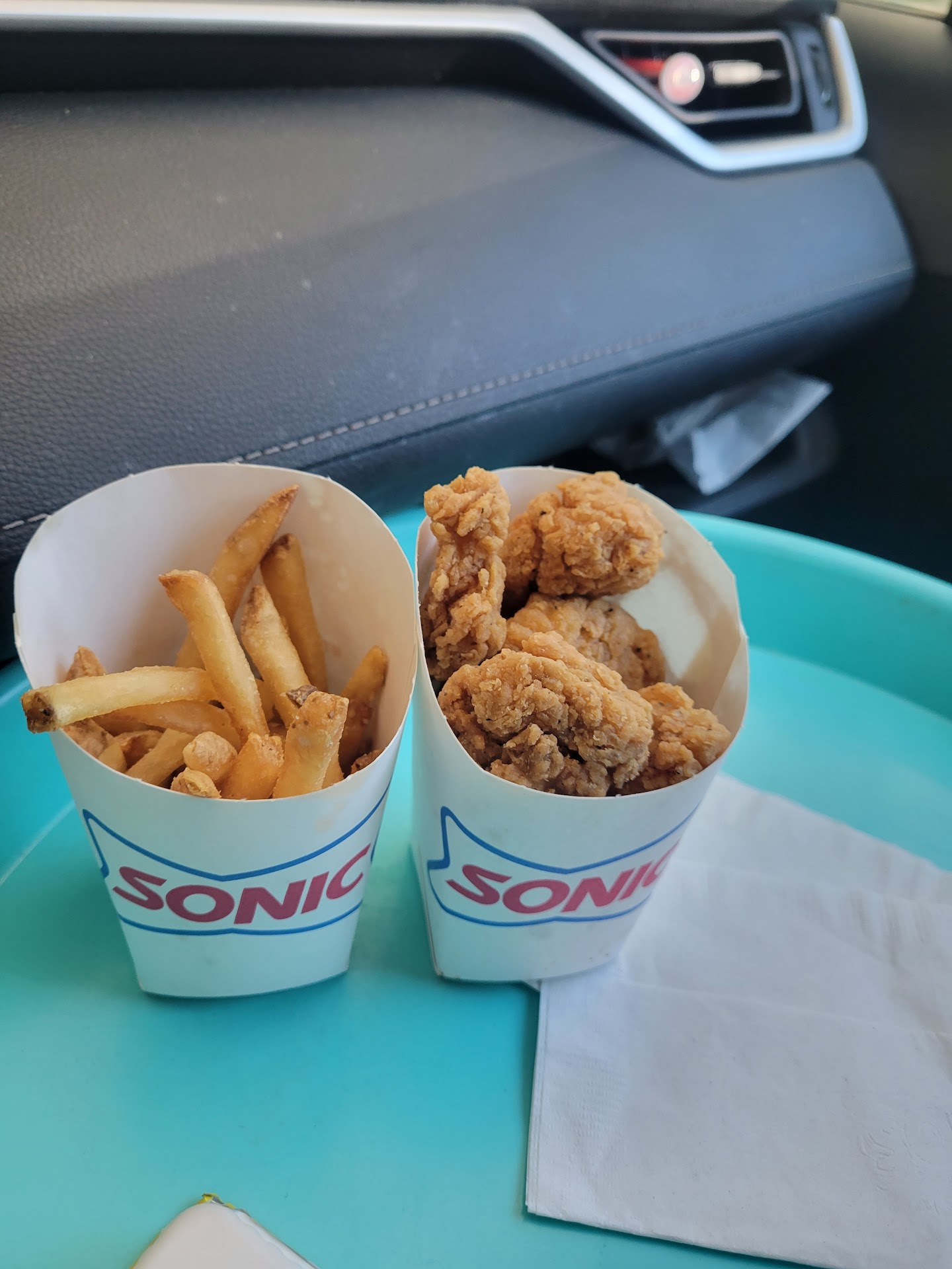 I love the menu at Sonic's. However, I don't really love this location. A year ago, my band director brought me and a few other students here, during a break we had between performances at a competition nearby. We put in our orders on the outdoor seating kiosk. When the last student put his order in, they didn't ask for payment or finalize the order. The first order came out fine, the second order waited on drinks even after the food came, but the last order didn't come at all. Drive-thru orders came and went, other people ordered from the outdoor seating kiosk and got their orders, and we were still waiting. We kept asking the carhop and she kept saying it would be coming up soon, but it never did. I'm certain they either canceled it or didn't even put it in. We were waiting almost an hour, and we ended up having to just leave to make it back to the competition. This put me off of this Sonic for a while.
