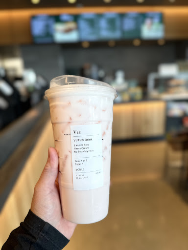 My daughter and I stopped in after shopping at Cabela’s. My daughter got iced water. She treated me to a venti pink drink (modified) no strawberries, heavy cream and 6 pumps of vanilla syrup.