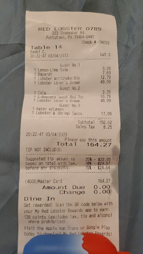Read moreWorst dining experience EVER. Took family there for wifes birthday and couldnt have gone any worse. It took 25 minutes for a waitress to come to our table and take our drink order. It then took another 25 minutes to get our drinks no exageration with the times either this is the truth. When she finally came back with the drinks...sodas.. she had to double check the mixed drink order...so my wife had to wait another 15 min just for her mixed drink. When they finalky decided to bring our appetizers they brought our dinners 5min later and made us just feel rushed nit to mention the lobster bisque was fridge cold and i had to send it back. The food was okay when it finally came out im not a fan of red lobster at all im a steak man and there steaks are mediocre so not a fan especially for the over prices menu but my wife loves it and it was her birthday. We were finally brought our check handed the waitress my card then she proceeded to clean other tables off and walk to the bavk all while having my credit card and not processing it in the register. At that point i had enough and saw a manager walk by i exolained to her everything that happened and she blew us off saying next time find me earlier its too late now. Mind you its the middle of a oandemic and the restraunt was only about 10% full and she made NO effort during our 2hrs in the restraunt to do a walk around and check on her customers. So sad i hope my wife never wants to go back bc this is not a favorite of mine. I would deffly discourage everyone i know to not step a foot in this restraunt again. I will deffly be telling everyone i know about this experience. TERRIBLE TERRIBLE TERRIBLE. I have NEVER had an experience...