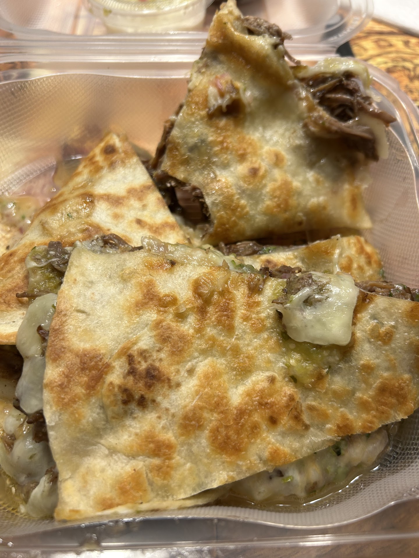 All the food I've had so far is pretty average. I ordered a birria quesadilla and found that the meat was soft and tender like you would expect, but the birria had none of the classic birria flavor. Even the consommé dip just looked and tasted like beef broth with some lime. It wasn't bad, but it wasn't what I was expecting. The chips and queso were also very average. The queso barely had any spicy kick, and it came with a small bag of Tostino's chips. I just wish the food was...