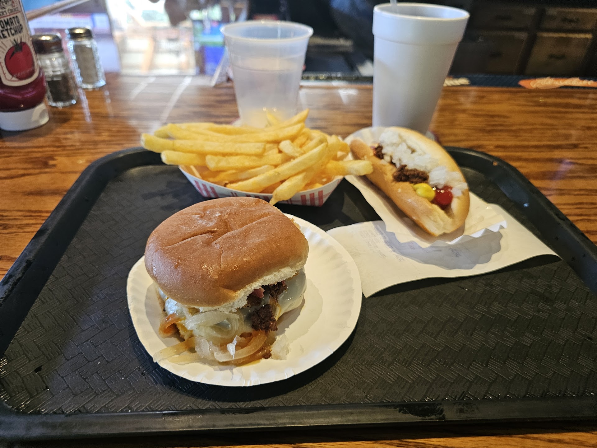 Read moreGood food however bad experience. Trying to avoid the potholes in the parking lot is like driving through an obstacle course. Drive thru does not have a menu but they do have a sign posted that they charge a 5% fee if you use a credit card for purchases under $50. However, senior citizens are exempt because their "system" does not allow them to extend a 10% senior discount. When you pull up to the window you drive over an air hose (the type that was used at full service gas stations). No one responded. I noticed a doorbell button which I pushed. Someone responded, I gave and paid for my order (3 cheese burgers 1 cheese dog and fries). Then I waited and waited and waited. The person in the second car behind me got tired waiting and just drove away. Then the one behind me pulled out of line and went inside which I did as well after a few more minutes. There was only a handful of customers inside but the outside area that serves alchohol was quite busy. There were several orders pending (hanging tickets) including mine. I asked for my money back. One young lady said she was starting my order so I agreed to wait (more waiting). Another worker asked for 2 burgers for an outside customer. They were made and served immediately. The food is good however I have...