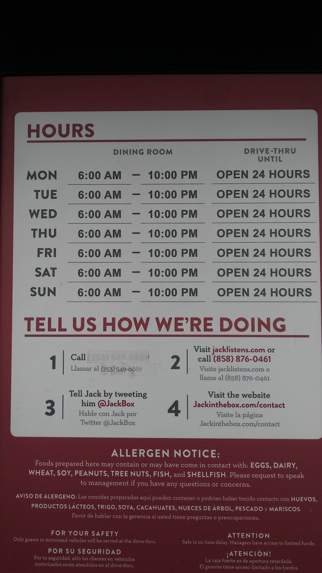 Ā Ā Ā Read moreMy wife and I visit this location once every few weeks. For the past 6 months or so, every time we visit this location, the exact same two vehicles are parked in the back corner of the parking lot. Itās very obvious someone is living in at least one of the two vehicles but whatās concerning is that every time we are there, employees are surrounding these vehicles. Today we counted 8 (EIGHT) people, some in JITB uniforms and others in plain clothes (one without shoes, in the rain) came flooding out of the vehicles with smoke billowing behind them. Whatās even more concerning is that the person who appears to be the āmanagerā or āPICā, whatever you want to call her, was with this group seen exiting the vehicles. And itās not the first time weāve noticed her āhanging outā over at those vehicles. It doesnāt take a rocket scientist to deduce that there are nefarious activities taking place here and we are shocked that itās been allowed to continue this long unchecked. My wife and I used to love JITB when we were younger so itās a nostalgic type thing to go have a Jumbo Jack or some tacos every now and again but this location is super sus and even though we live in the area, we will not be back until the riffraff in the parking lot is sorted out. Itās a bad look for the business and makes us question what other poor behavior is given the blind eye inside of the establishment.