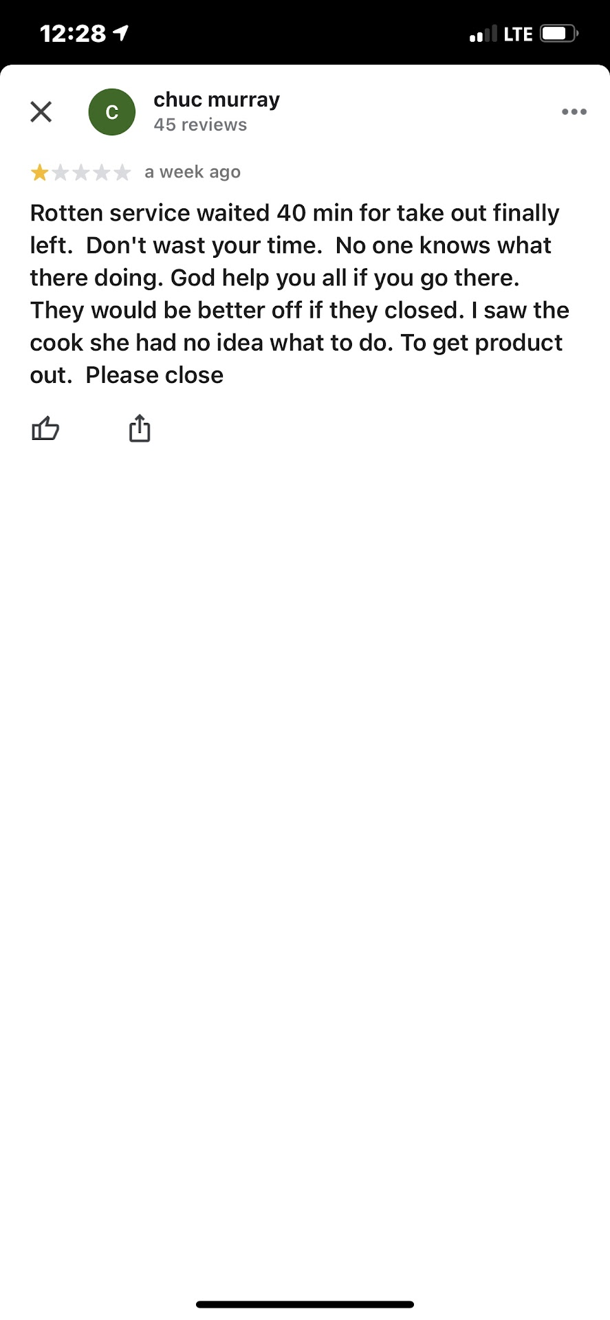 Read moreThe only good thing I can say about this place was our waitress was very pleasant. That is why I gave 1 star. So unless you like your Mongolian beef to taste so sweet it taste like you are eating a spoonful of sugar with every bite instead of spicy, your sweet and sour chicken to taste like it was water down by adding a lot of vinegar and water with a little sweet and sour taste, your garlic chicken wings to taste like someone dumped a cup full of salt on the whole batch of wings and the house special chow mein that came with 2, yes 2 small shrimp. When I asked if any rice came with the meal I was told, "due to the situation and the economy at hand, rice does not come with the meal, it would be 2 dollars for each small cup of rice. It should of been a red flag to us when we went in there at 4 p.m. on a Friday and we were the only ones there. So to conclude we spent 70 dollars (that did not come with rice) for a barely edible meal and an owner that obviously is trying to cut corners and the food. We will definitely not be back. Especially when the owner did not care to hear...
