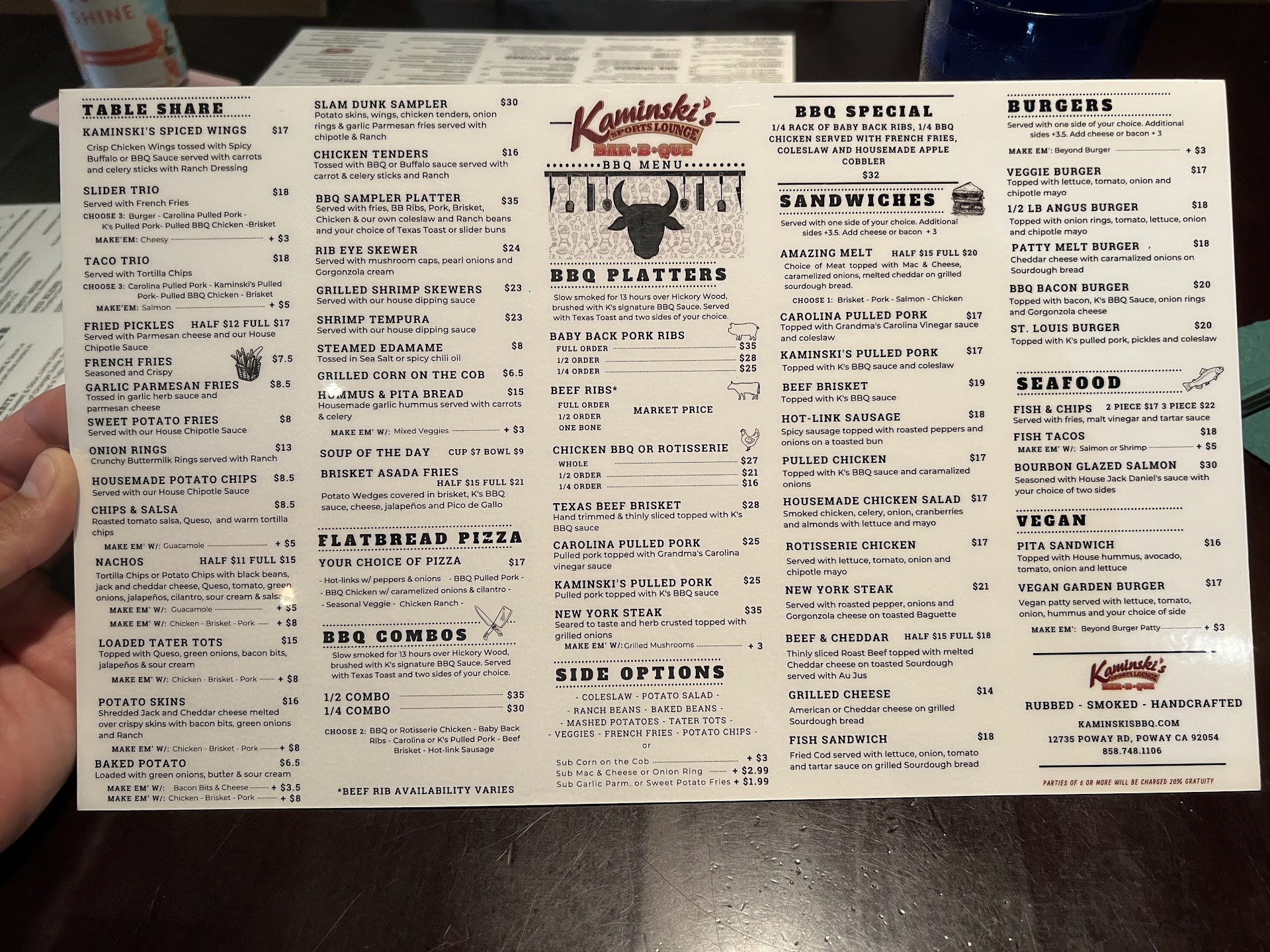 When I complained about my order, (I got the loaded fries or something like that and swapped to wedges then added pulled pork.) I was able to swap to the chicken tenders and Mac n cheese instead. (Mid) If you are used to food that has no true flavor or is very very VERY bland and overcooked at times... look no further than Kaminskis Poway. And be prepared to pay more than the food is worth for sure. Our waitress was nice, she wasn't a problem at all. But for a larger party we did quite a bit of waiting. We got there and sat for so long before drinks arrive and before our order was even taken. Food wasn't so far behind at least (and I would hope not just based on the quality.)