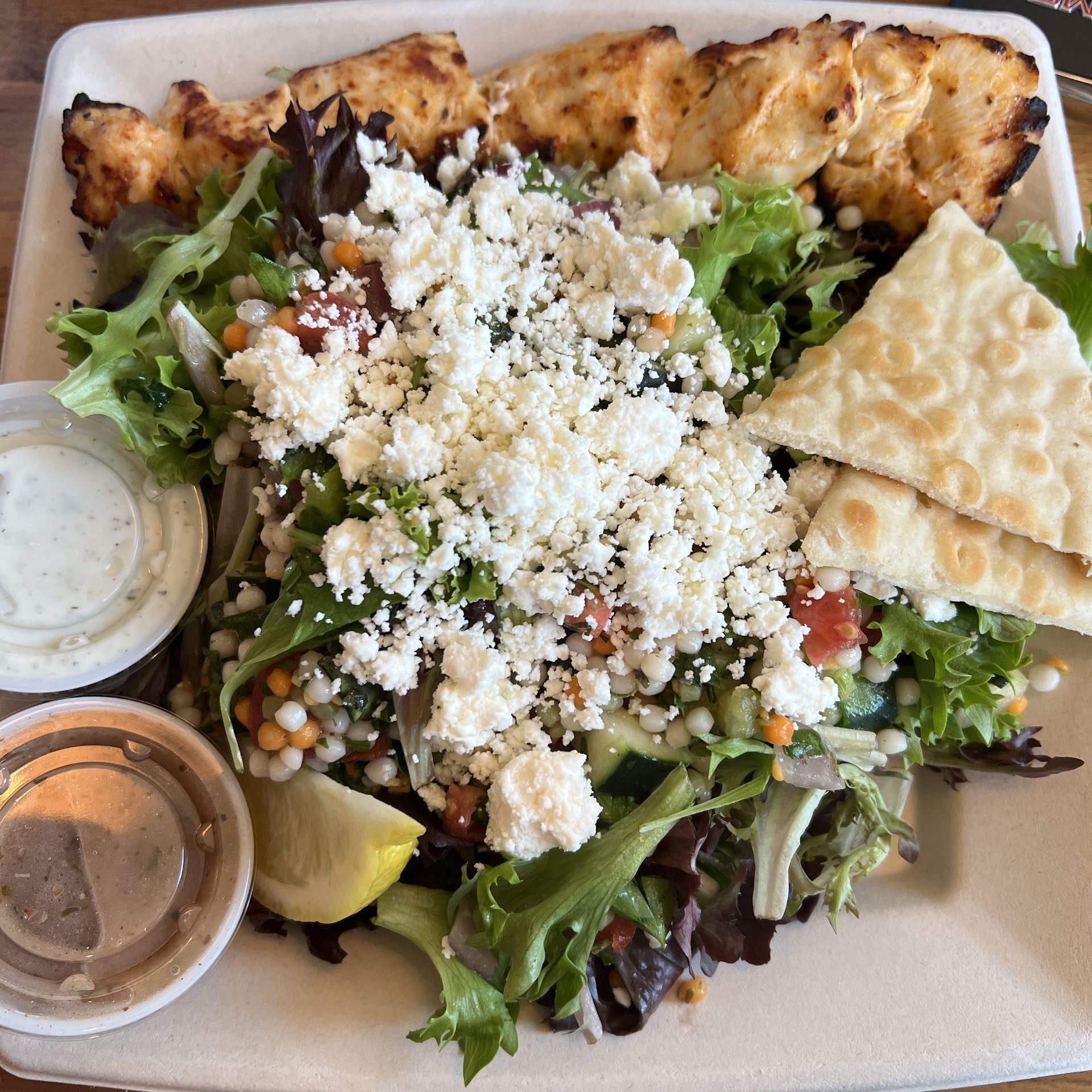 Read moreThe food is very good, eastern Mediterranean flavors with plenty of great options. The dishes have great balance and are truly as they are supposed to taste, there is no spoilers from chasing trends, kale, quinoa, ancient grains, etc, nothing inappropriate to the dish is randomly added just to appear trendy. This chain doesn't even toss raw onions, dices tomatoes, and lime into any dish to mexicanize it like most other San Diego restaurants. What you taste is truly what the dish was meant to be. The environment is more fast food style and not much done for noise abatement, but service is fast and food is great so it's easy to overlook these issues. This is a preferred restaurant chain for me. Be sure to try out their interesting sauce choices, and yes, the salmon was tender, not raw...