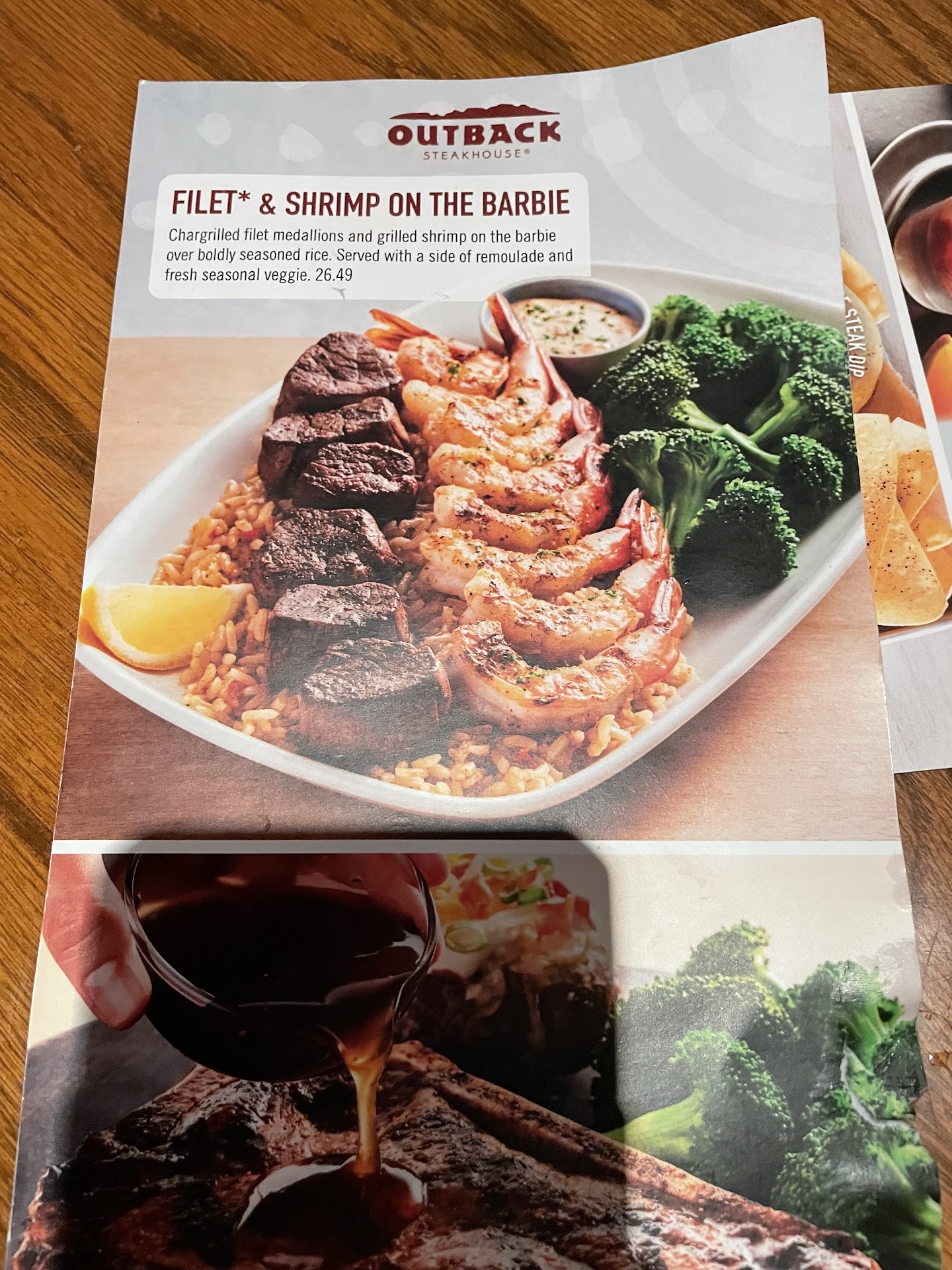 Our Bloomin Onion arrived and it really was delicious! Shortly thereafter another waiter brings.out our main courses. We thanked him and as he walked away noticed one was chicken and the other was Shrimp.