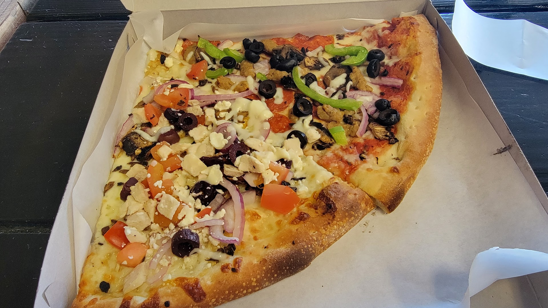 Pizza -Dough/Bread: moderate body, enjoyable chew on the outside softer in the middle. -Sauce: Either a marina or pomadoro I couldnāt tell. -Vegetables: holy moly these were fresh and cooked to perfection. Crunchy and sweet bell peppers. -Meat: hints of fennel in the sausage, pepperoni was what you would expect. -Cheese: Mozzerella? Not sure. Stringy and melted just right.