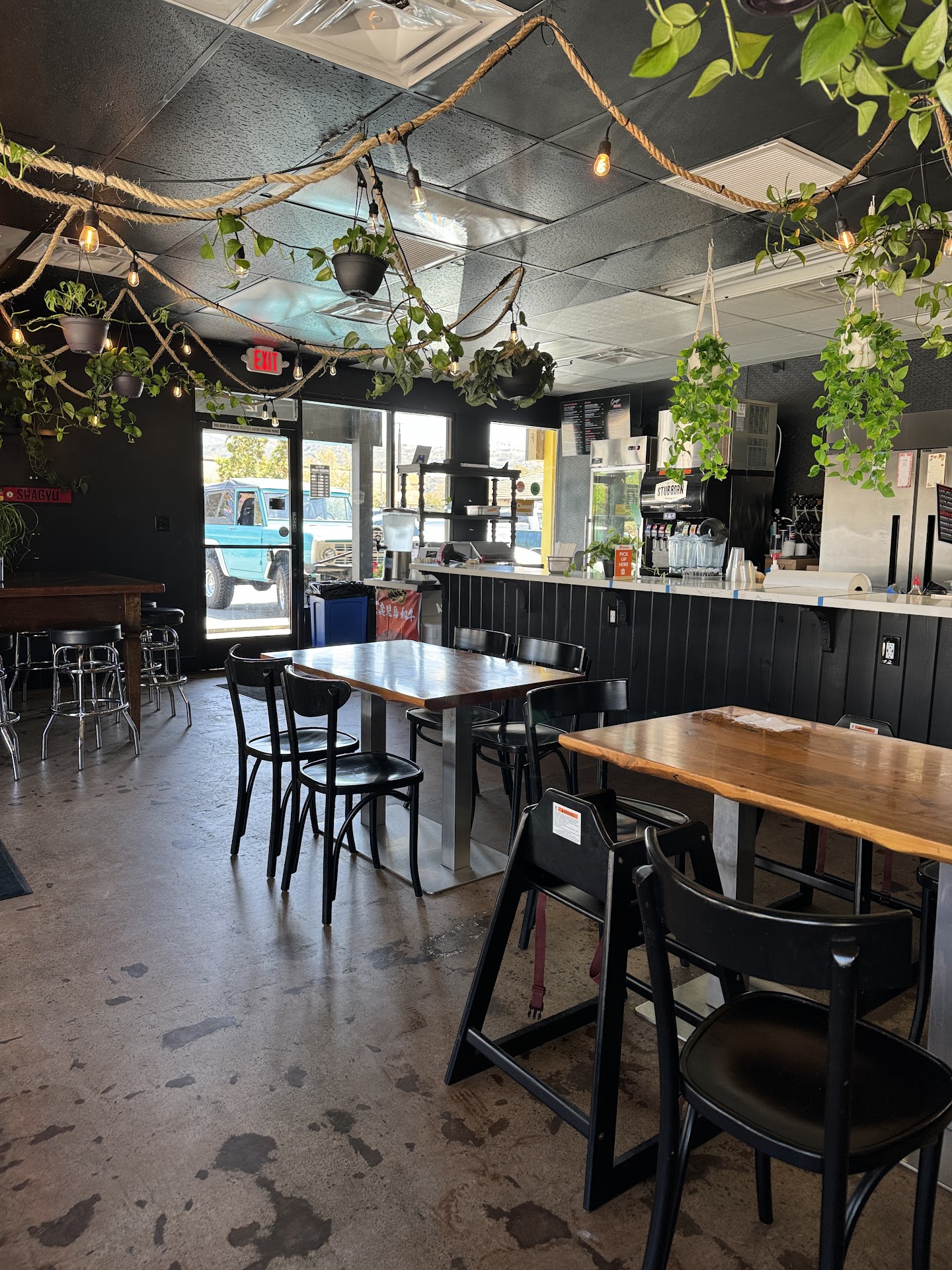 The restaurant has indoor and outdoor casual dining, albeit the outdoor tables are right next to busy Twin Peaks Rd. Inside, the restaurant has attractive trailing plants set against black and natural accents, bringing a touch of the outside in.