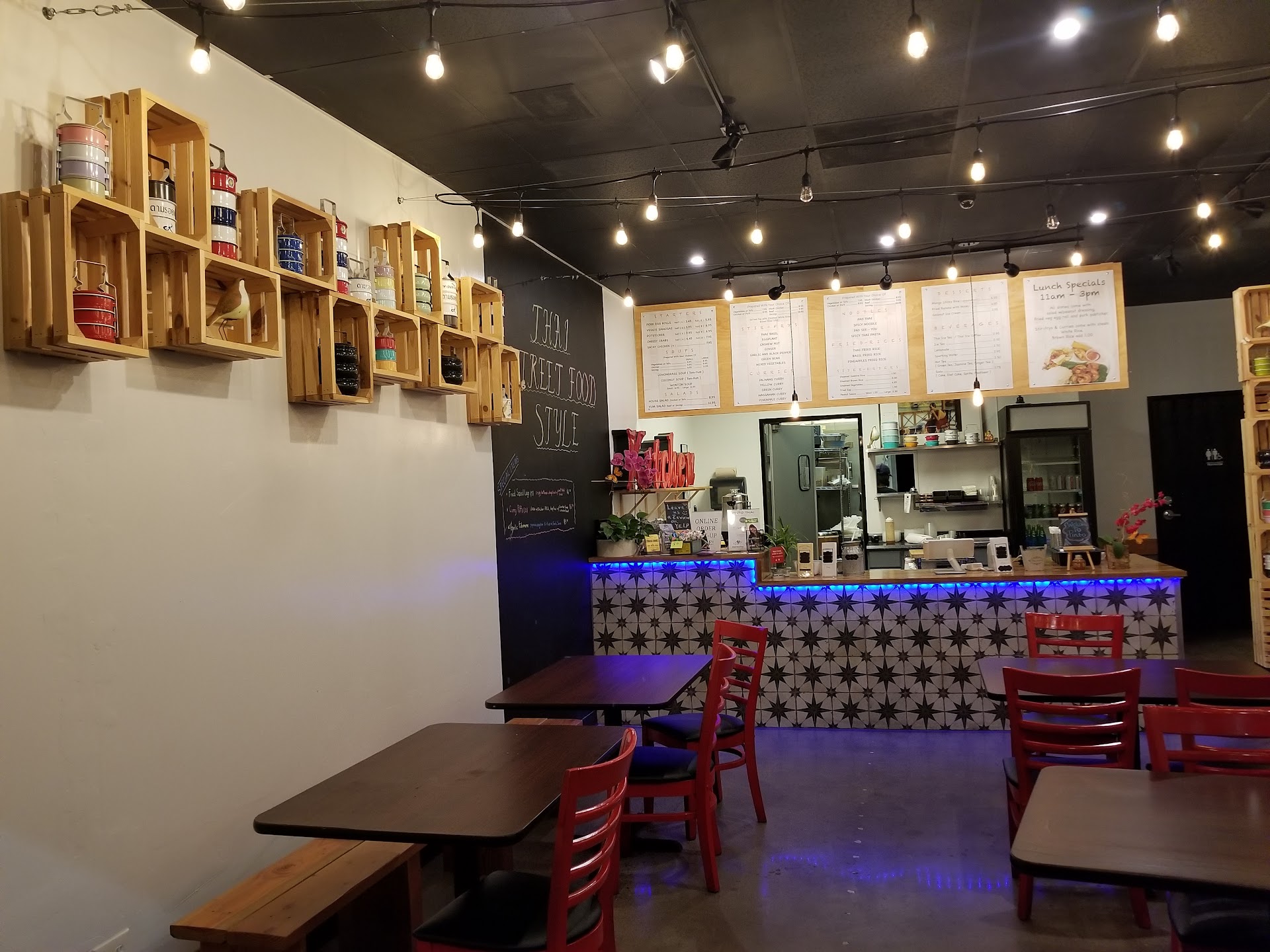 Food: good quality, everything seems fresh (vegetables were great) and it's made relatively fast. We got the pad thai and spicy noodles (drunken noodles). Menu is short and sweet, all the regular Thai stuff. They ask what level of spiciness you want. Try the coconut milk with tapioca - sweet with a fruity hint; almost reminds me of horchata.