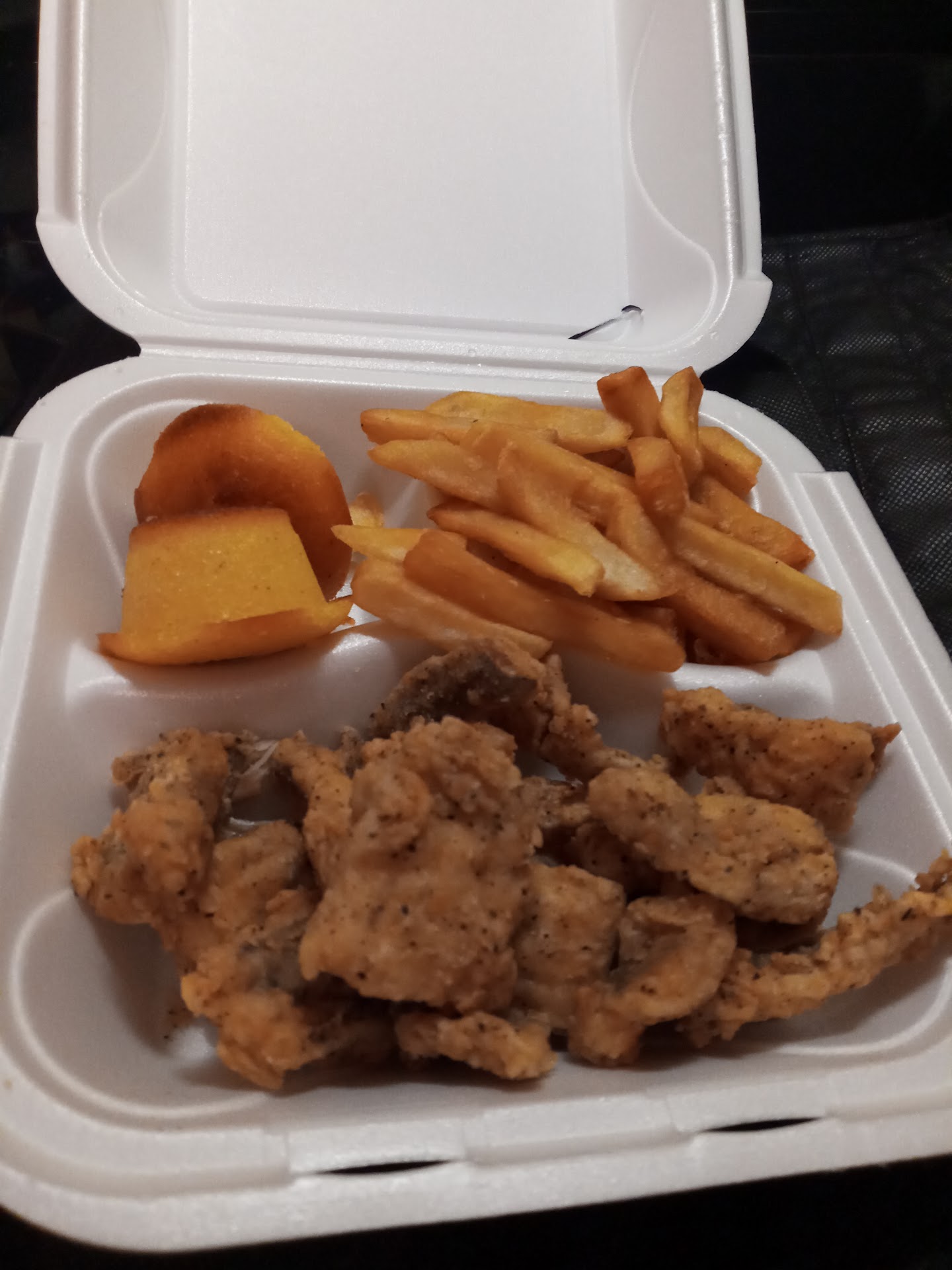 I gave this restaurant 3 stars because, while it could have been better, I understand we ordered close to closing time which might explain the issues. The person who took our order was friendly and helpful, but the food we received was disappointing. I had ordered a 2-piece whiting meal with fried okra and mac n cheese, but was told they only had 1-piece whiting with french fries available. I was fine with that and added two cornbread muffins to go with it. However, when I got home and opened my order, I was greeted with a bunch of small unattractive pieces of fish that look like chicken livers or gizzards--nothing like the whole piece of whiting I was expecting. The fish smelled old and fishy, and most of it had an edible black fish skin that I had to remove to even make it halfway decent. Only one piece tasted like fresh fish, which made me think this restaurant could have been much better under different circumstances. Nowhere on the menu did it mention anything about "fish nuggets" or "fish pieces"--it was misleading, and I would have preferred to be told they were out of whiting rather than received what felt like scraps from the bottom of the bag. The mentality seemed to be, "it's late so whatever--we'll just give her this." On the plus side the french fries and cornbread muffins were good, so there is some potential here. I would be willing to give this place another try, but next time I'll come earlier in the day when, hopefully, the kitchen is stocked and the staff has more energy to care about the quality...