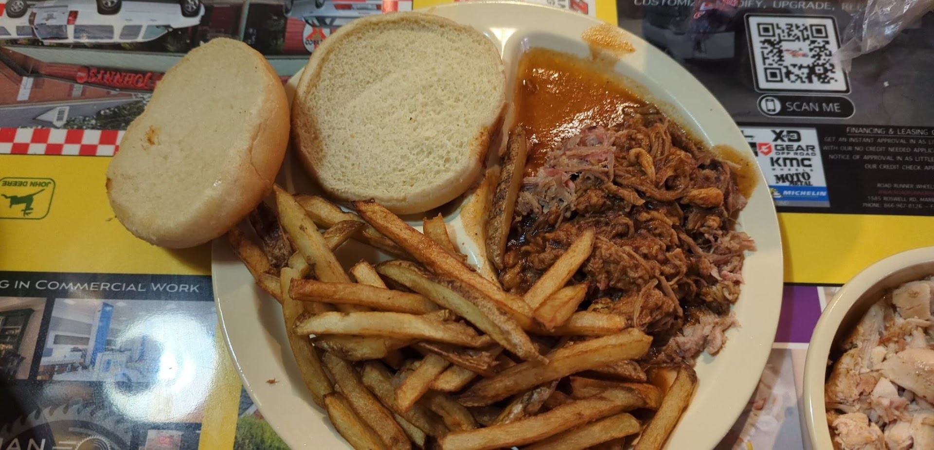 I always like to leave a review no matter good or bad and I’m so disappointed to have to leave a bad review. Just moved to the area in November and have driven by multiple times. From the outside it is that kind of place that intrigues you. Last night my husband and I both wanted barbecue and what better time than to try Johnnys. We love barbeque so much we even had it catered at our sons recent rehearsal dinner. Walking in there is a lot to catch your eye. The restaurant did seem clean and if you are looking to purchase anything from boots to jeans to knives it’s here. We both ordered the pork plate which came with fries. He ordered sweet potato fries and I regular. Neither of our fries were crisp but lay limp on the plate. The barbecue was very vinegar tasting and really just had no Smokey flavor at all. Our waitress was personable and attentive but we go for good food. I’m sorry but we with everything this area has to offer we will not be going back here. Very disappointed I couldn’t leave a better review.