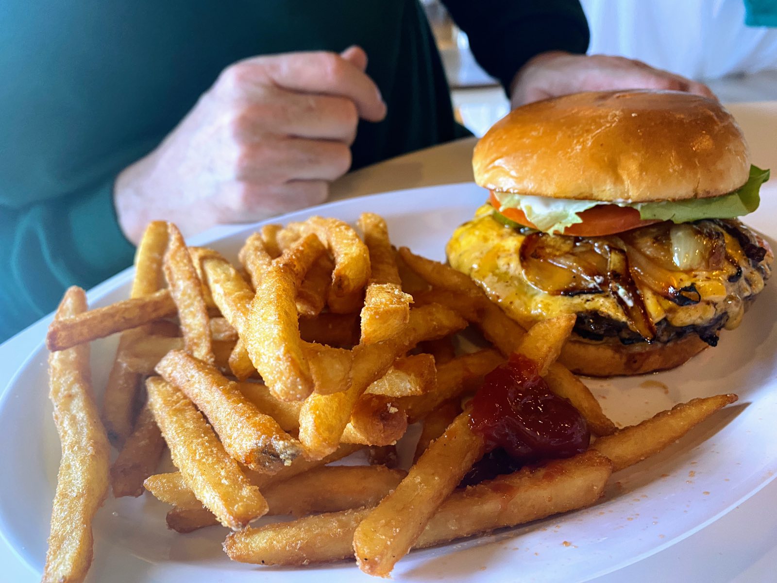 We arrived in the door and were greeted by a bright, wonderfully remodeled dining area with gracious hosts and a delightful menu of what we would call “gourmet burgers”, sandwiches, wraps and pasta. The fries, and onion rings were to die for.