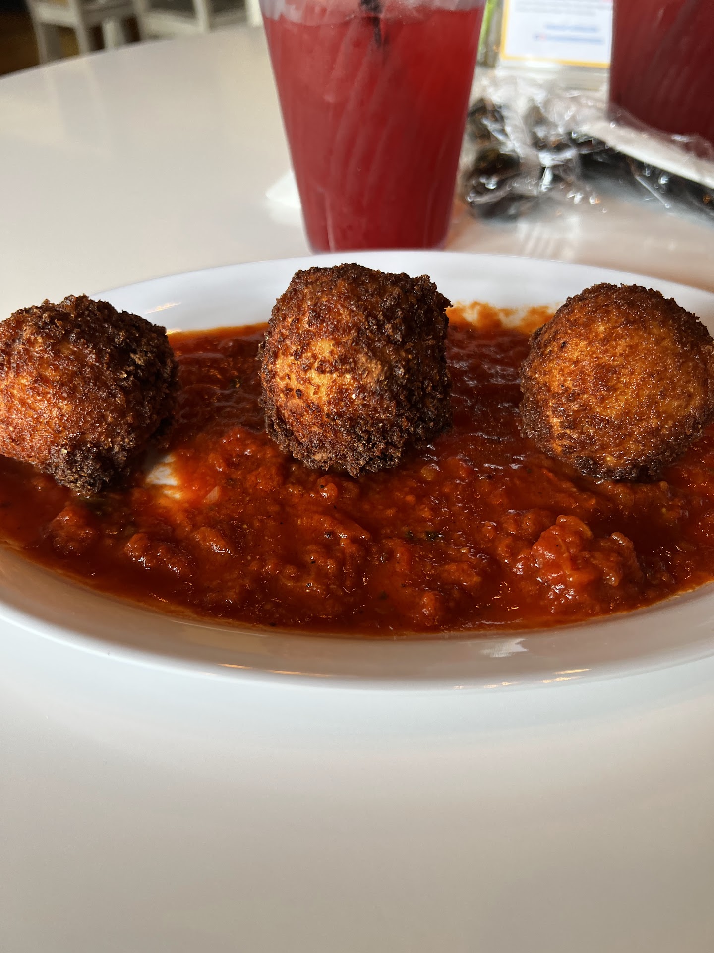 Those mac & cheese balls were delish. They’re served with marinara. I was wishing the inside had a little more flavor but they paired well with the marinara. We had the black cherry lemonade; it was refreshing— not overly sweet or sour. If you like sweet, this is not for you. And…. They do not come with refills.