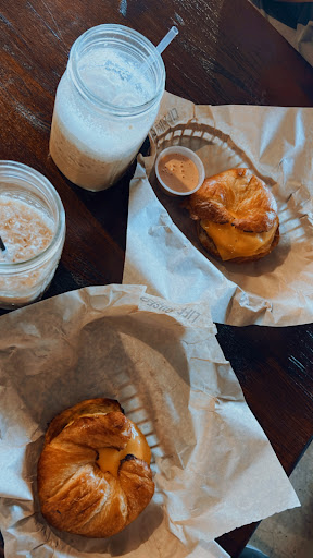 For breakfast, I always get the croissant with sausage, scrambled egg, Gouda, and cheddar cheese, and it’s to die for!