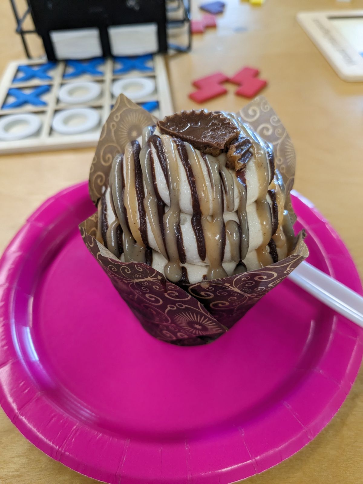 Delicious CUPCAKES, peanut butter/chocolate, French silk and cookies and cream cheesecake, which were decoratively gorgeous. The 2 cake based cupcakes were filled in the middle too. The drinks we had, chai tea, cupcake frappe, made with the whole cheesecake cupcake (or for variety any cupcake of your choice) and a Bahama Breeze lotus tea. The drinks were also amazing. Cafe Hope's mission is to support local efforts to educate and elevate individuals, with intellectual and physical needs, to gain greater independence. Who can't support those efforts and eat/drink marvelous food in the process? It's well worth a visit when you're in Prairie du Chien, WI. They also have a gift shop with priced items and items available by donation. Again it's worth the stop. (Peanut butter/chocolate...