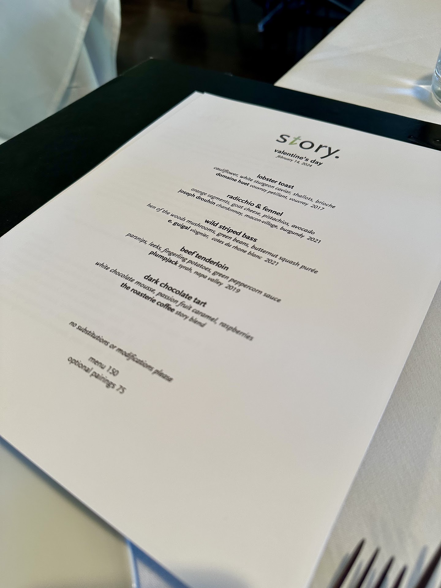 Read moreWe brought some friends from out of town last night to Story for an 8pm reservation. Our server, we joked, gave the impression his girlfriend had just broken up with him. One of our friends ordered steamed veggies ($28) due to dietary restrictions- it was brought with what appeared to be butter on it which he cannot eat. We asked the server if it was butter and his response was “oh yea it has a ton of butter ALL over it.” When we communicated he couldn’t eat that the server went off and got the manager. The manager came over, took the plate and we requested it to just be removed from the bill. No big deal. He came back with the plate a few minutes later however and said he talked to the chef and it was actually oil. We said the server told us it was butter and he replied “well, he is apparently misinformed” placing the plate back on the table… zero apology. The server then came and announced “last call” from the bar which is the strangest thing I’ve ever heard at a fine dining establishment. He then took a full cocktail from the table and referred to it as a “dead soldier.” When we left we walked by the bartender, our server, and the manager and no one acknowledged we were leaving. No thank you, goodbye, come again just total silence. There were still other tables in there at this time, too. It was the strangest several hundred dollars we spent! Honestly, the food was (butter situation aside) without fault and truly delicious. The front of the house was incredibly underwhelming and unprofessional at best. I do not recommend. If I were the chef I would be incredibly concerned because people aren’t going to want to come back when they feel like they are being a nuisance for...